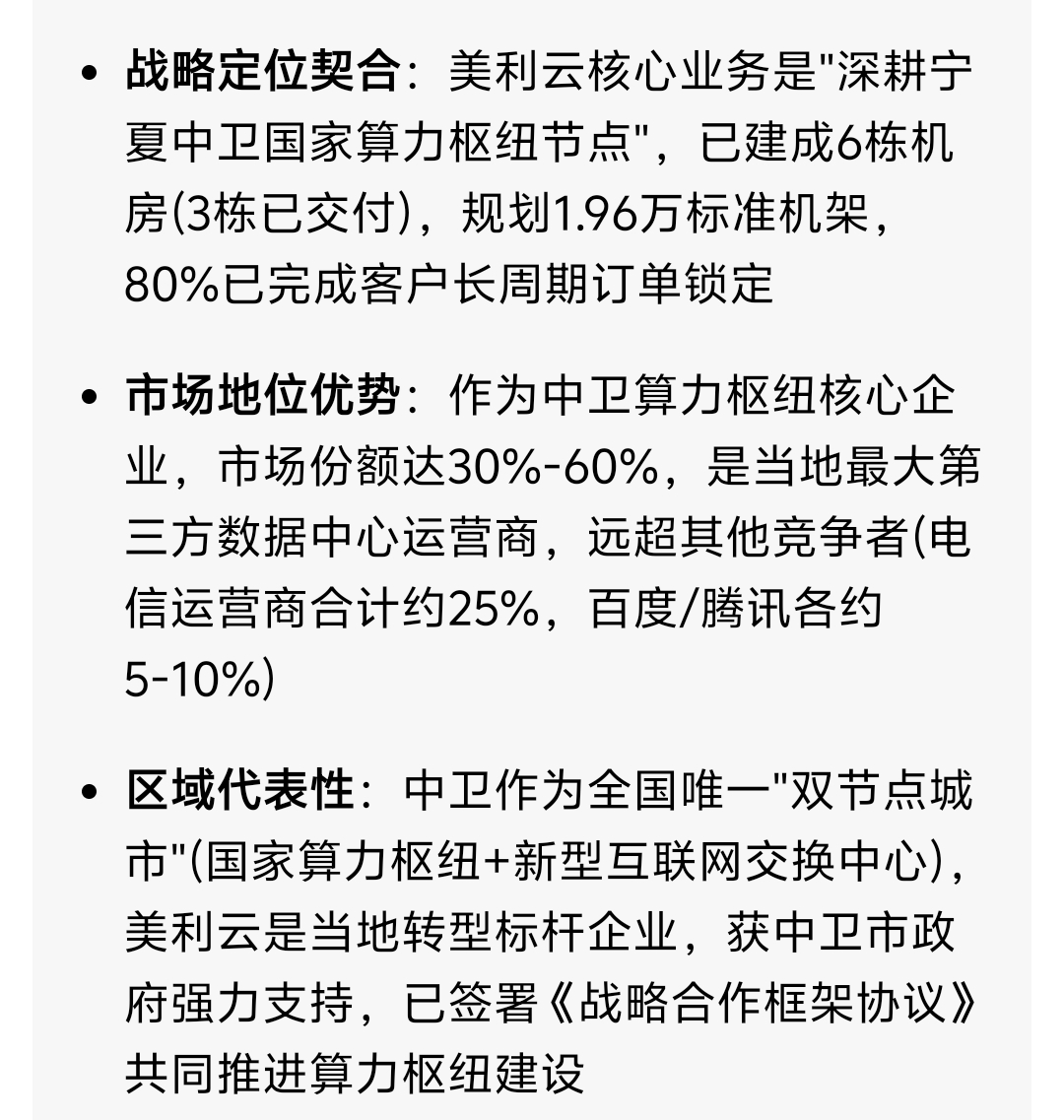 $美利云(SZ000815)$ 宁夏中卫国家算力枢纽…- 政企协同优势:作为宁夏国资委重点支持的央企(中国诚通控股33.27%),美利云已被纳入中卫"东数西算"核心项目,获专项贷款和土地资源支持