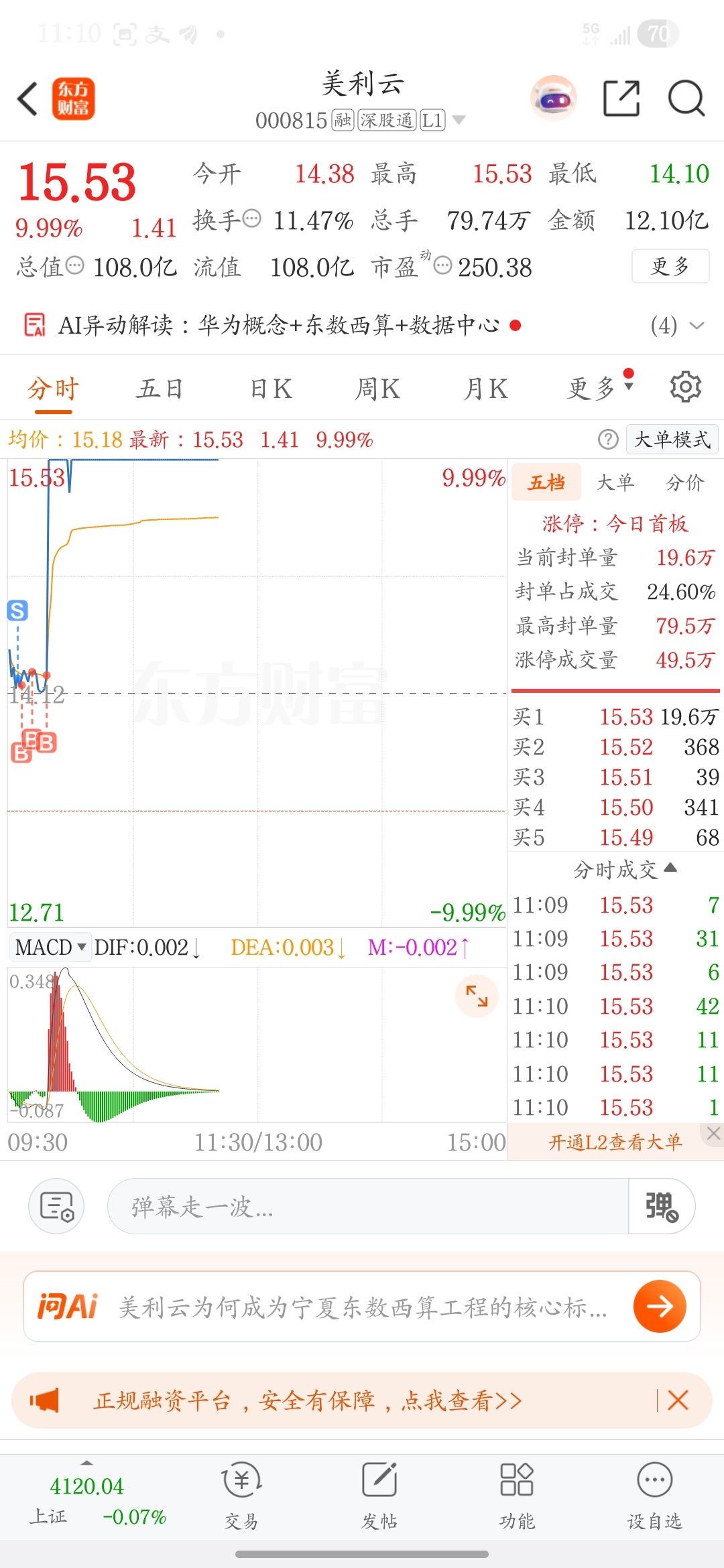 $美利云(SZ000815)$ 早就说这票会起来,刚好t完,刚好加仓完,直接一秒封板,真美丽