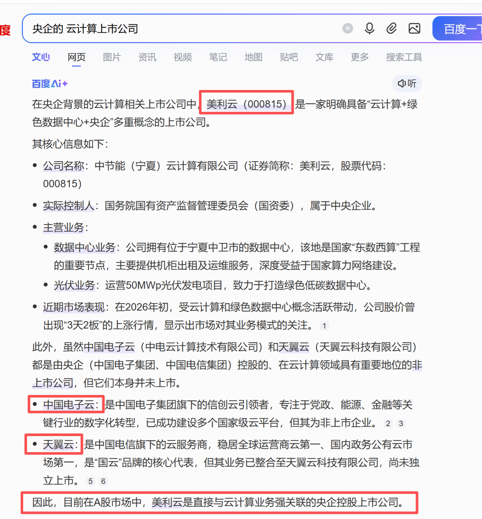 $美利云(SZ000815)$ $云赛智联(SH600602)$ $网宿科技(SZ300017)$ A股唯一云计算央企。