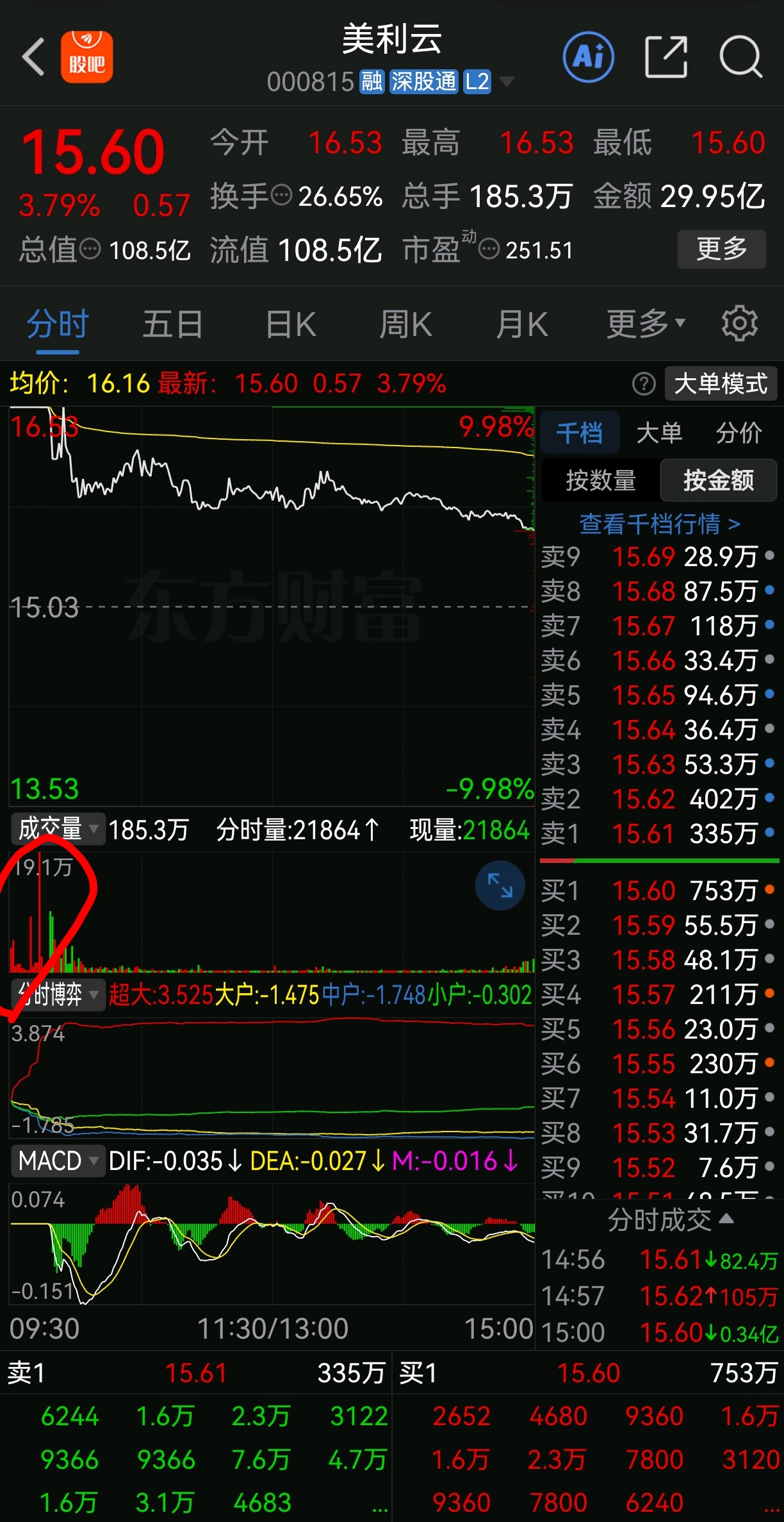 $美利云(SZ000815)$ 开盘30和31分就有两笔共两亿资金砸盘,封从13亿直接减为8亿,这时候看盘的人就应该很警觉了,然后39分,43、44,三次都被砸开板,说明卖盘太大了,而且还是在前排龙头大为和海量封死的情况下,三封三砸来,说明很多大资金源源不断的再卖。直到48分第四次开板,再多的幻想都应该破灭了,这个时候还不跟着卖的,除了不看盘的,真不知道咋想的,格局也不是这么格的。