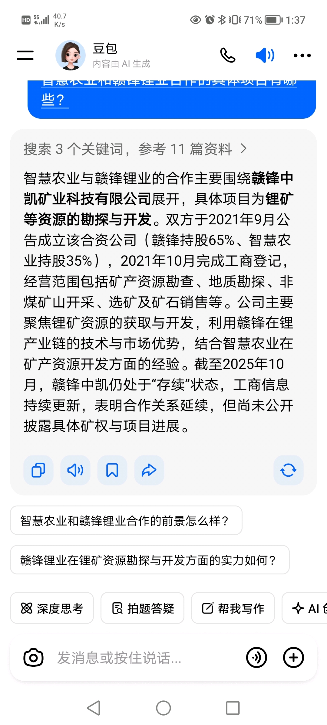 $智慧农业(SZ000816)$ 智慧农业与赣锋锂业的合作主要围绕赣锋中凯矿业科技有限公司展开,具体项目为锂矿等资源的勘探与开发。双方于2021年9月公告成立该合资公司(赣锋持股65%、智慧农业持股35%),2021年10月完成工商登记,经营范围包括矿产资源勘查、地质勘探、非煤矿山开采、选矿及矿石销售