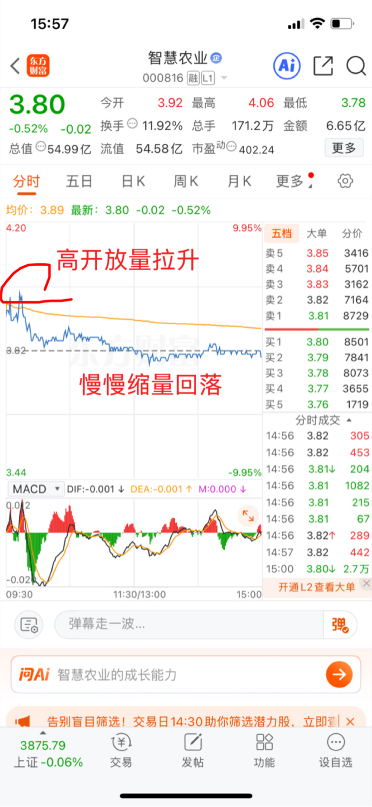 $智慧农业(SZ000816)$ 小智今天之复盘:过多的分析就不说了,今天小智高开放量拉升,然后缩量慢慢回落,这很有洗盘动作,故两点半后挂2.81买进三分一底仓,明天如有冲低动作会做T,高开冲高就锁仓,股市有风险,投资需谨慎