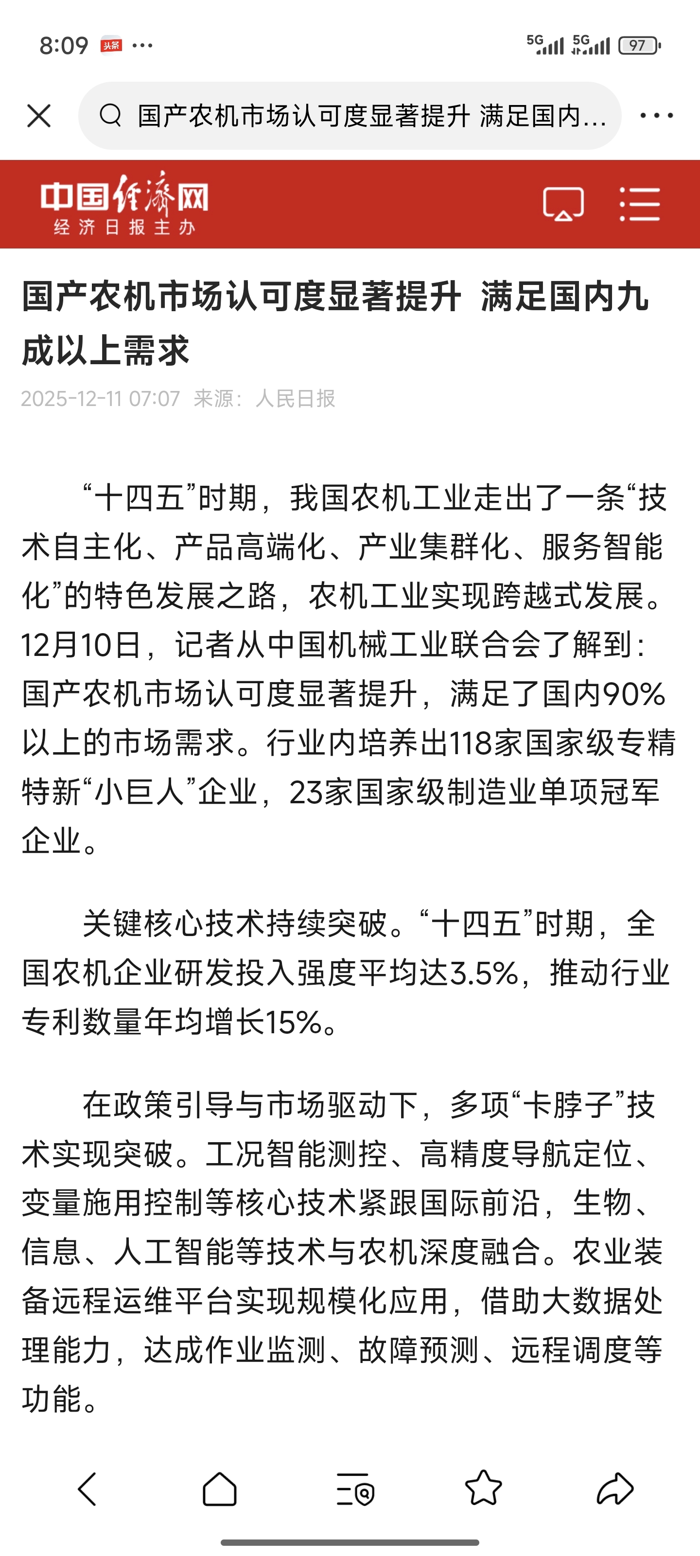 $智慧农业(SZ000816)$ 怪不得昨天农机板块起飞。 中国机械工业联合会有关负责人表示,“十五五”时期,农机工业还要强化技术创新驱动,聚焦智能农机装备、绿色动力、核心零部件等重点领域,突破无人农场系统、农业机器人、氢燃料动力等关键技术,构建自主可控的技术创新体系。同时,努力培育3至5家具有全球影响力的百亿级龙头企业。