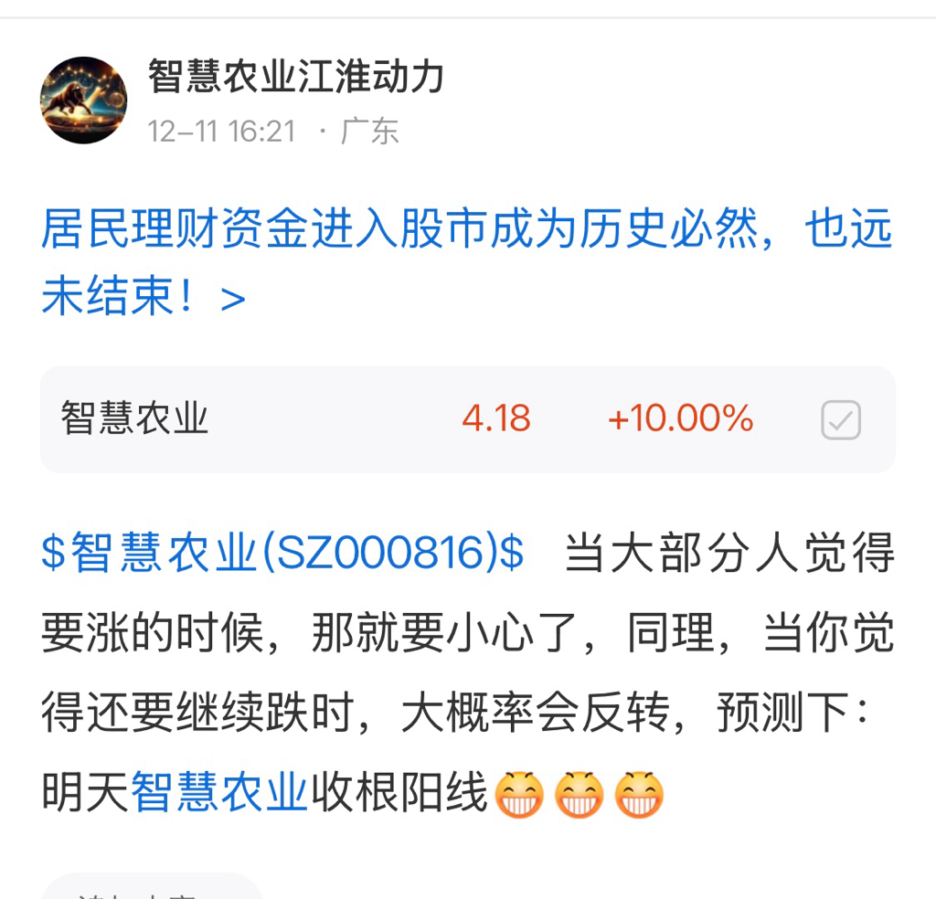 $智慧农业(SZ000816)$ 现在这种成交,做T才是最爽的,量化把人性分析的淋漓尽致,亏钱基本都是追寻快感,喜欢打板,追涨杀跌的股民,我们的对手盘永远都不是庄家,是我们自己,5年股东经验建议大家,谨慎追高,但也应无惧下跌,做时间的朋友