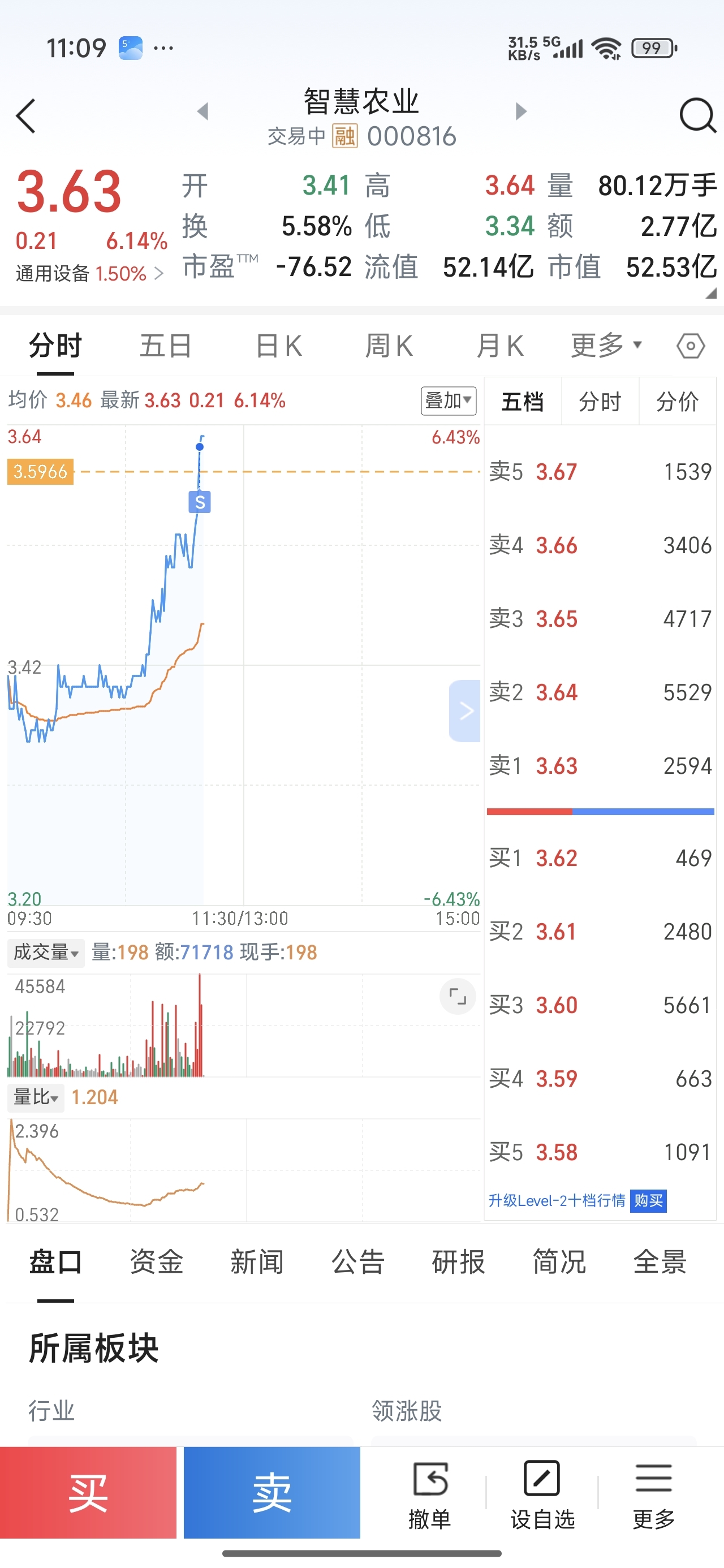 $智慧农业(SZ000816)$ 完了完了要卖飞了,我没得选,人穷志短,马瘦毛长。