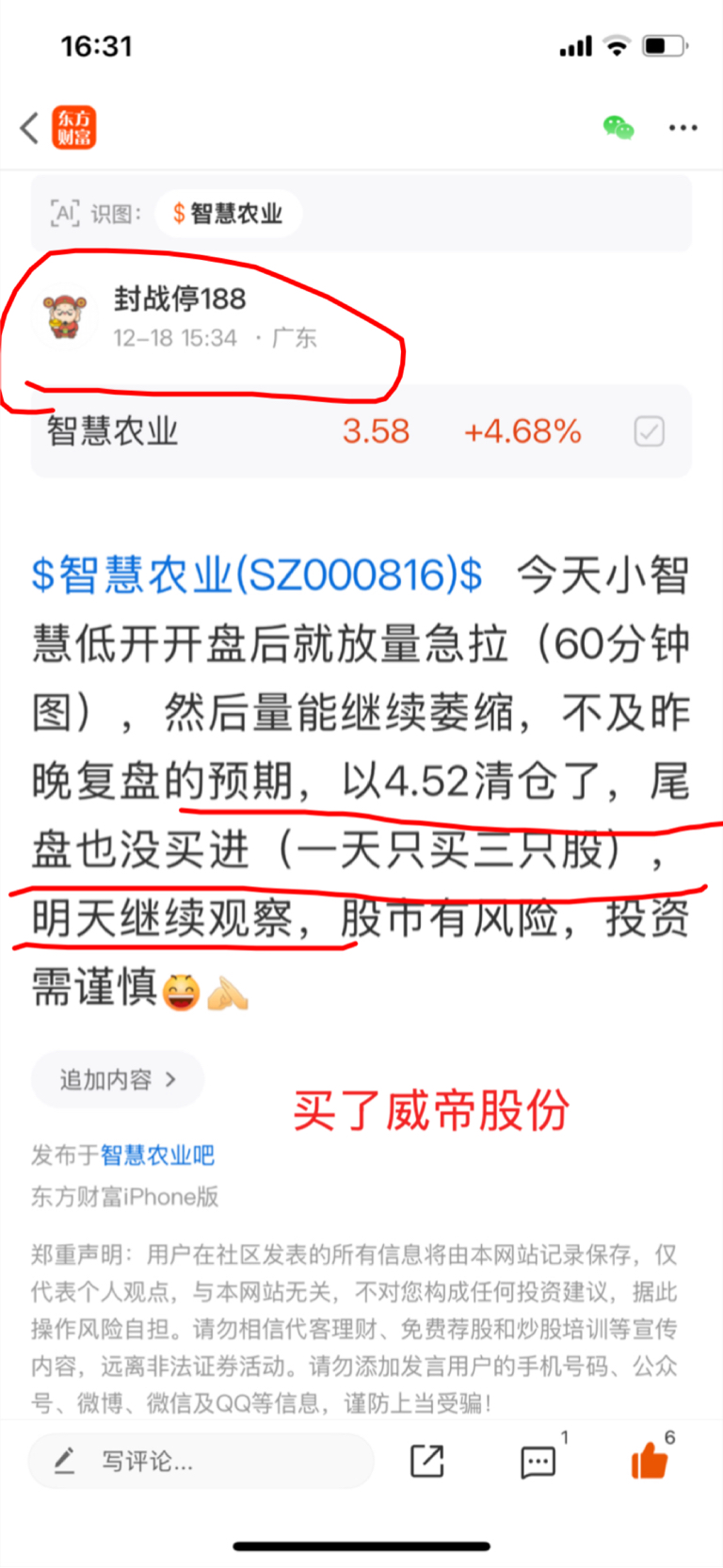 $智慧农业(SZ000816)$ 如果不是一天只买三只股,今天小智慧冲低挖坑我就会建底仓,又可以轻轻松松赚6个多点,但买了小威,就只能放弃小智慧,今天小智慧放量上攻,星期一应该有个回踩的动作,就是说如果低开冲低就可以再次建底仓,高开没底仓的最好观望,毕竟股市有风险,投资需谨慎