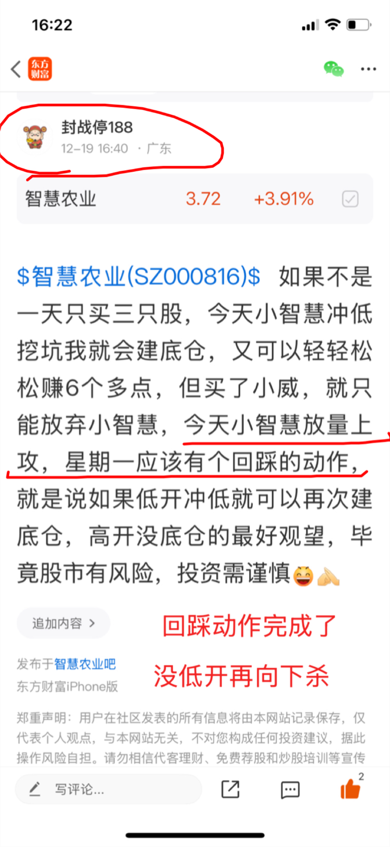 $智慧农业(SZ000816)$ 今天小智慧以3.59开盘,开盘后回踩昨天收盘价,如果按照我上星期五的复盘,我就会建底仓,但由于我仓位还在小海王和小威那里,故今天小智慧我也没动,如有底仓的股友,在小智慧拉升之前千万不要卖掉底仓,明天如果高开只能观望了,(今天没完成低开再向下杀)如果再次低开就是再次建底仓的好机会,TTT,股市有风险,投资需谨慎