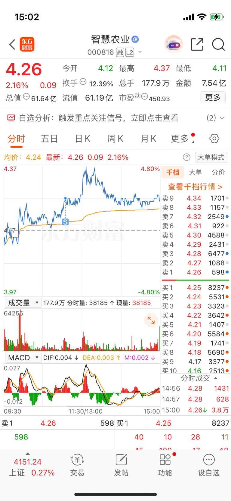 $智慧农业(SZ000816)$ 尾盘砸了个大单,这是调整信号么,反正4块以上,只卖不买,我是不敢追高