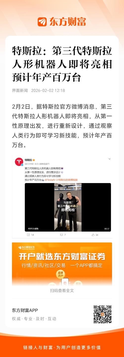 2月2日,据特斯拉官方微博消息,第三代特斯拉人形机器人即将亮相,从第一性原理出发,进行重新设计,通过观察人类行为即可学习新技能,预计年产百万台。