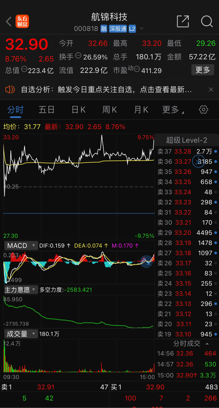 $航锦科技(SZ000818)$ 千档行情涨停板处只有2.7万手挂卖单,集合竞价主力进了3.3万手。