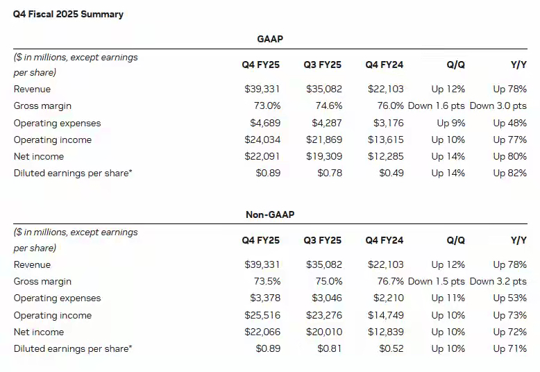 $航锦科技(SZ000818)$ 【英伟达:第四财季净利润220.91亿美元 同比增长80%】财联社2月27日电,英伟达2025财年第四季度营收393亿美元,比去年同期增长78%,其中数据中心业务收入为356亿美元,比去年同期增长93%;第四财季净利润220.91亿美元,同比增长80%。英伟达四季度调整后EPS为0.89美元,同比增长71%。英伟达首席财务官克莱特·克雷斯披露,2025财年第四季度公司交付了110亿美元的Blackwell芯片。2025财年英伟达营收达到1305亿美元,同比增长114%。Non-GAAP摊薄每股收益为2.99美元,同比增长130%。公司预计2026财年Q1营收区间为430亿美元上下浮动2%。公司将于2025年4月2日向所有在2025年3月12日记录在册的股东支付每股0.01美元的下一季度现金股利。
