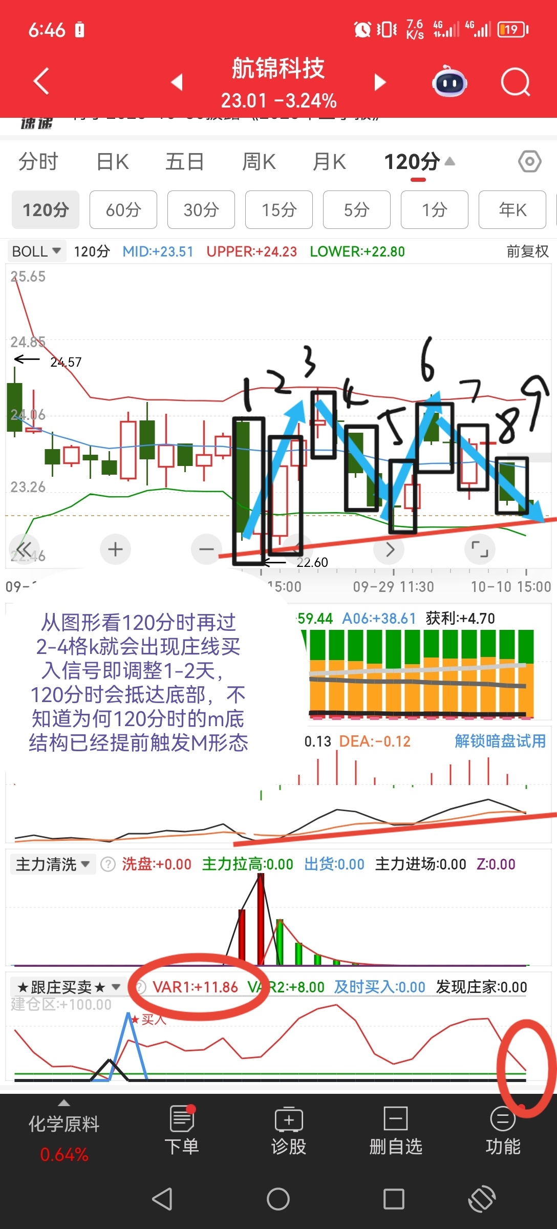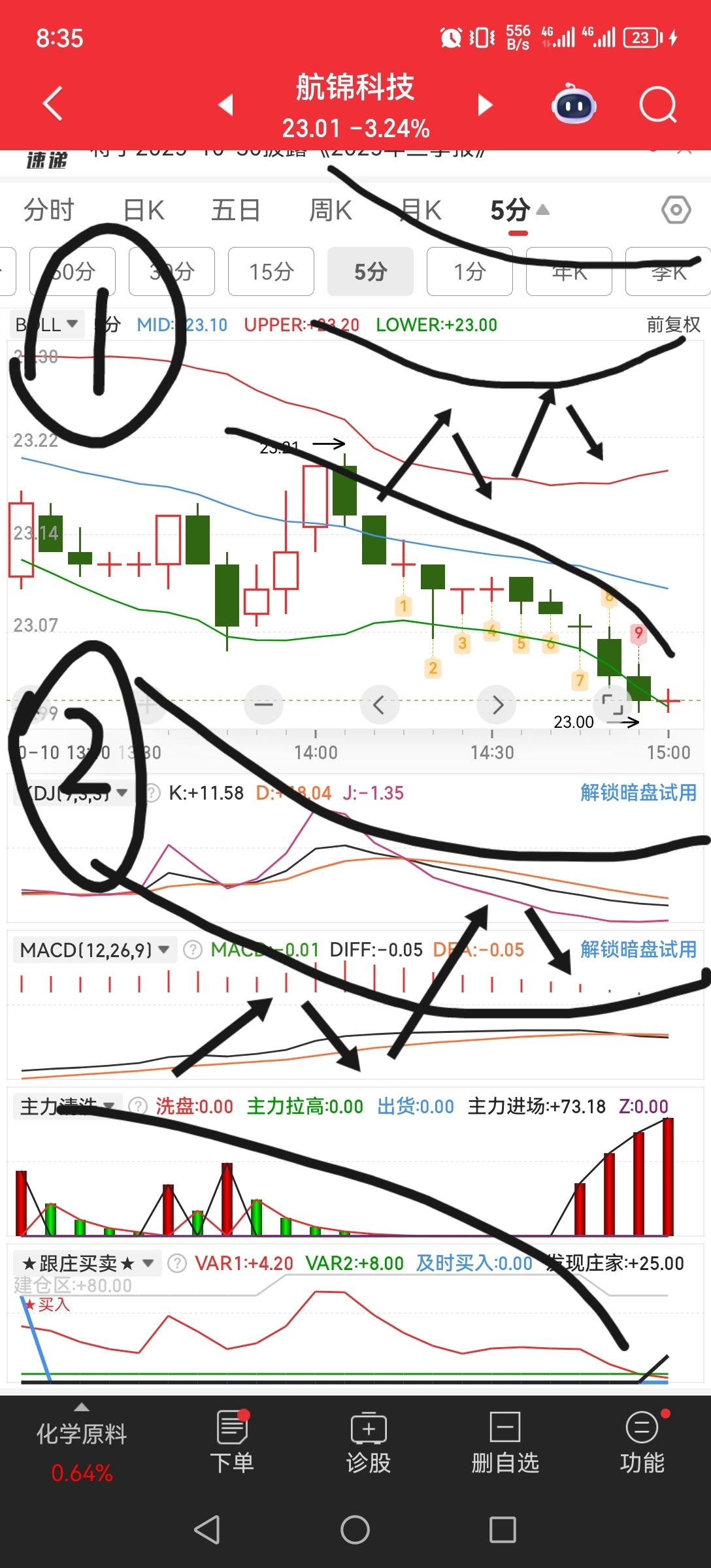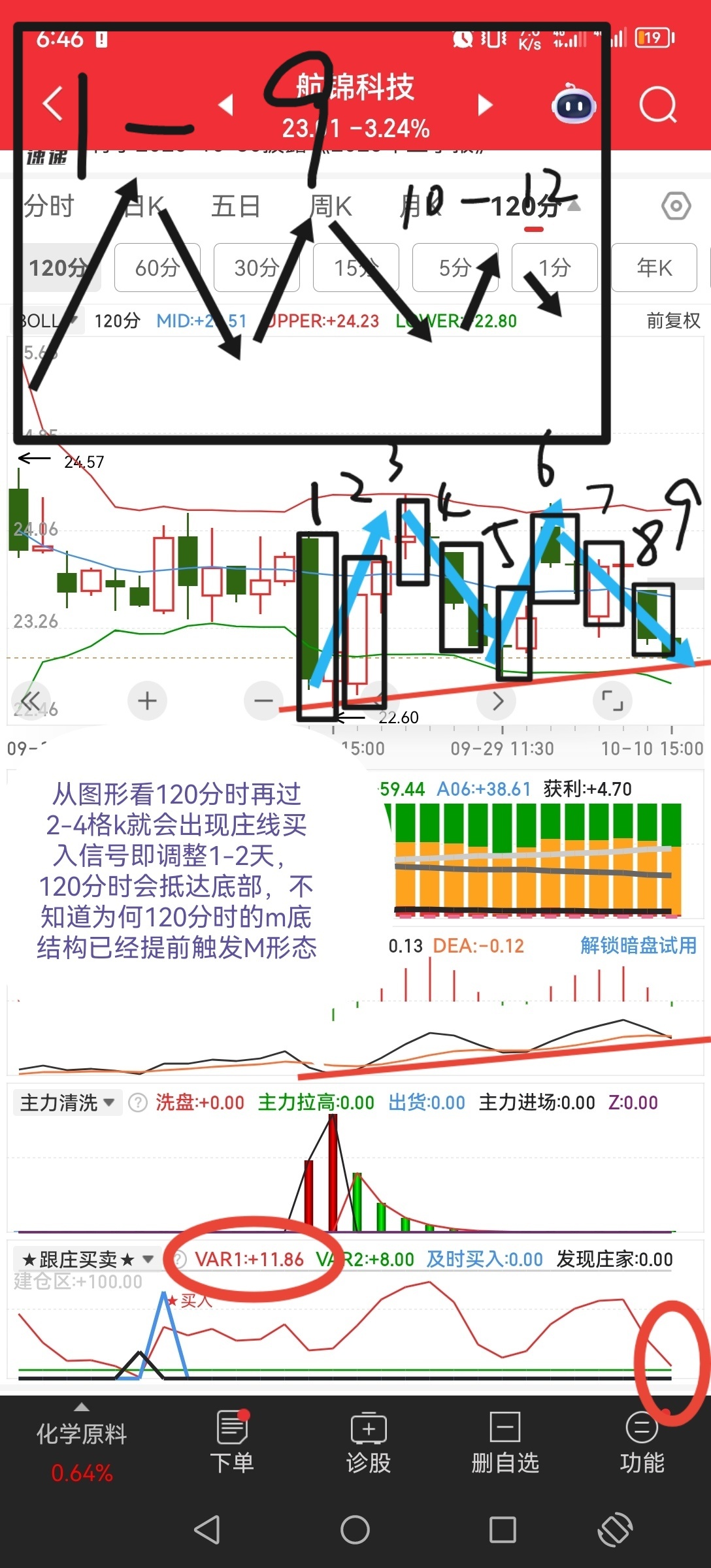 除了5分时那个图是按照结构去画的别的都没有,是按照趋势画的,明天跌破了22.6,也不用怕也是抄底机会,大不了重新再来一次m底反弹形态,抄底需要结合大分时庄线是否到了低位哦,目前看120是在11低位了,日线还在33中位的,因为后面我分析都是下班后才做图的,属于马后炮,实际还需要自己实盘观察趋势