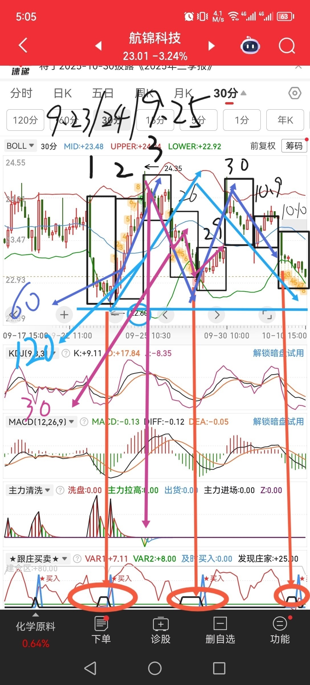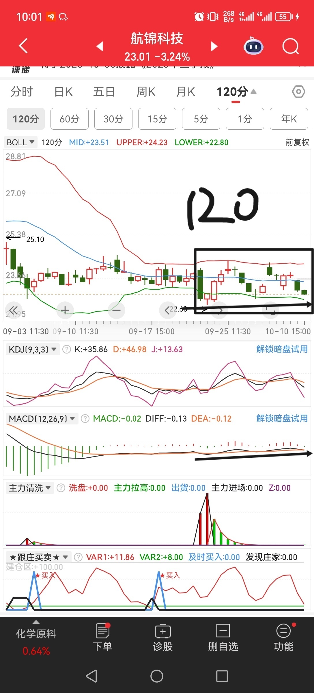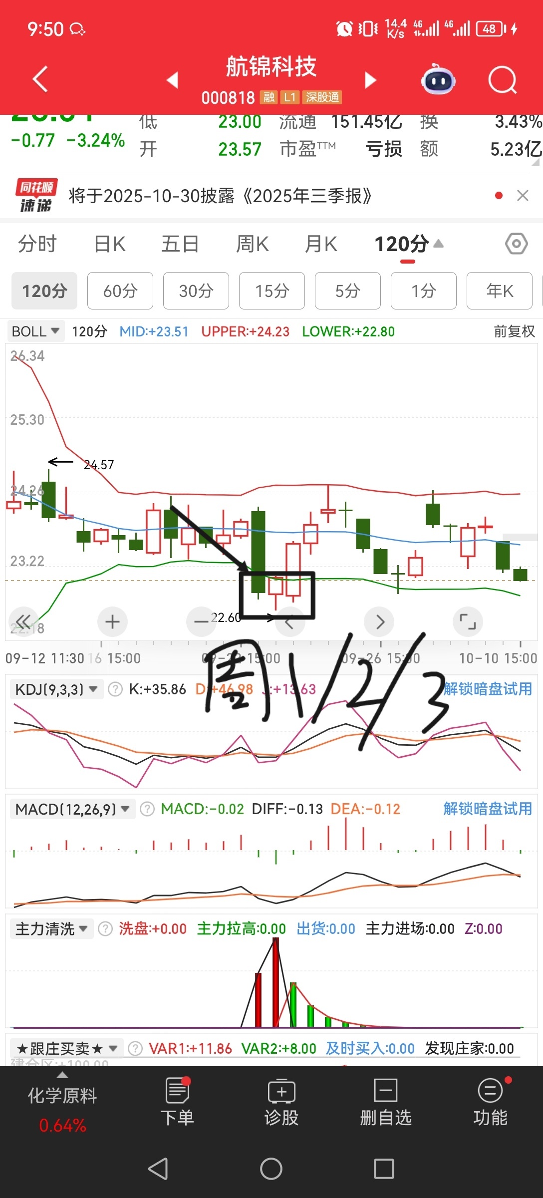 如果跌破22.60,留意boll线的上下线(中线不用管)是怎么个变法,打开的说明有戏,三条线都是往下的那就按它倒的方向走,不用着急买入,等上下线出现减缓了可以小资金试错博反弹,到时候可以按照新的节点划分120/60/60/30/30/30/30,也有可能会跌破日线的低位,这里我也不知道是不是22.60,跌破了以两组120分时结构重组