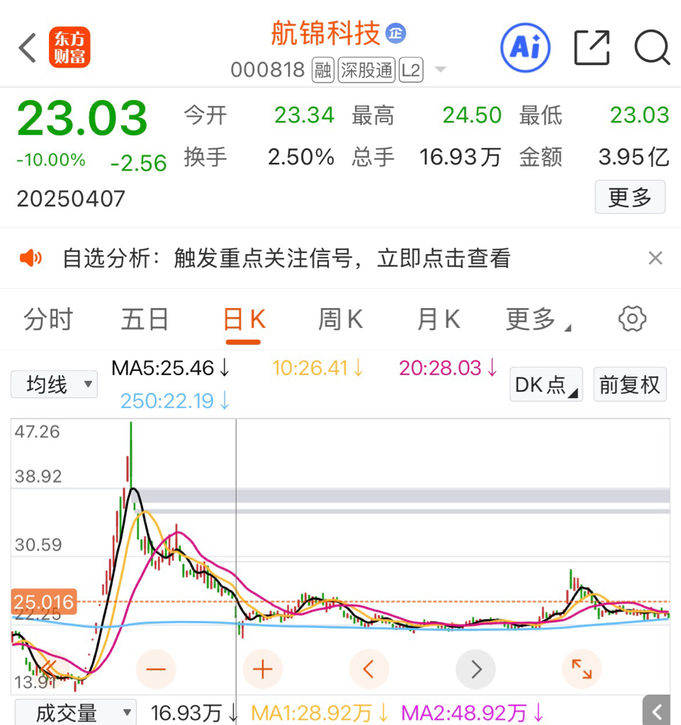 $航锦科技(SZ000818)$ 航锦科技现在的价格就是4月7号跌停的价格。还能跌多少?支撑位22.83军工票