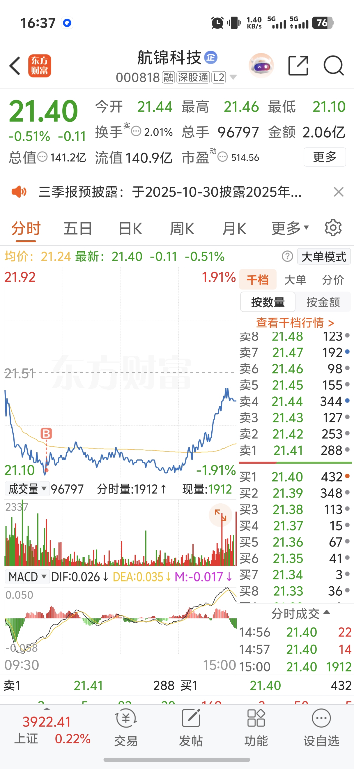 $航锦科技(SZ000818)$ 基本最低点又抄到底了,明天如果大盘不放量继续冲高卖出,但我感觉明天大盘会高举高打,航锦科技也会反转放量上冲