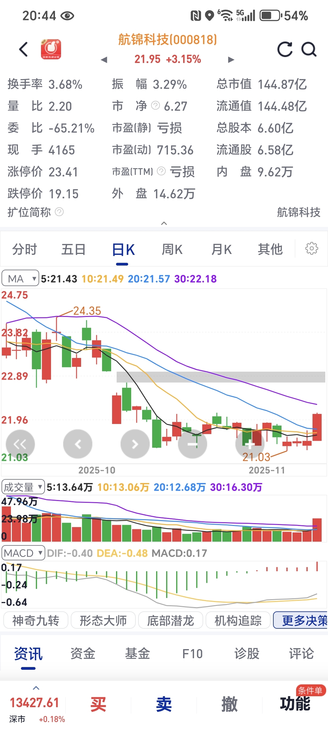 $航锦科技(SZ000818)$ MACD指标已经负数金叉几天了,近期一直底部运行,今天一根小阳,指标向上趋势明显,坐等强势上行!