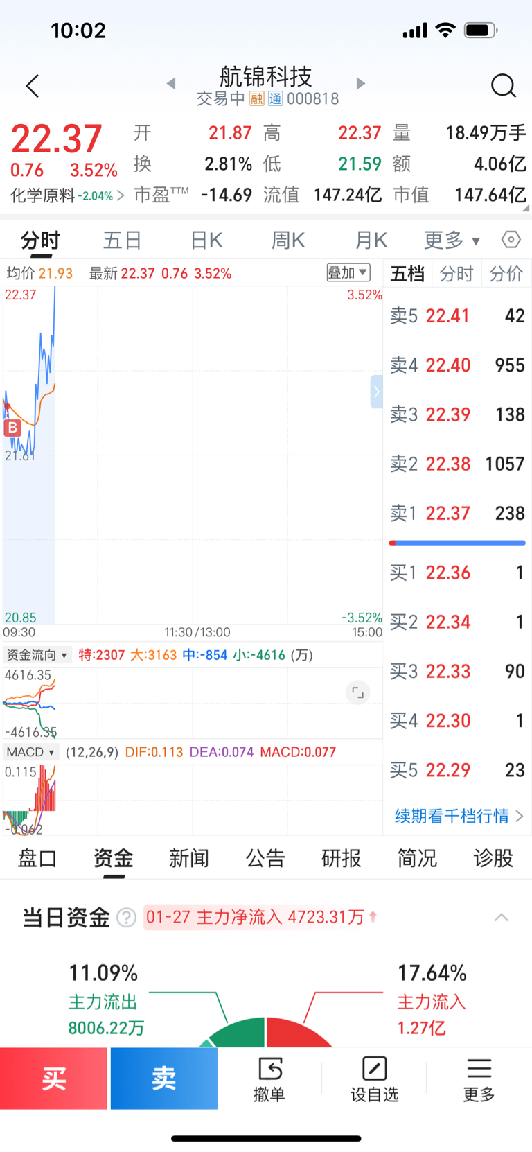 $航锦科技(SZ000818)$ 开盘买了就下杀还以为要套了,加油