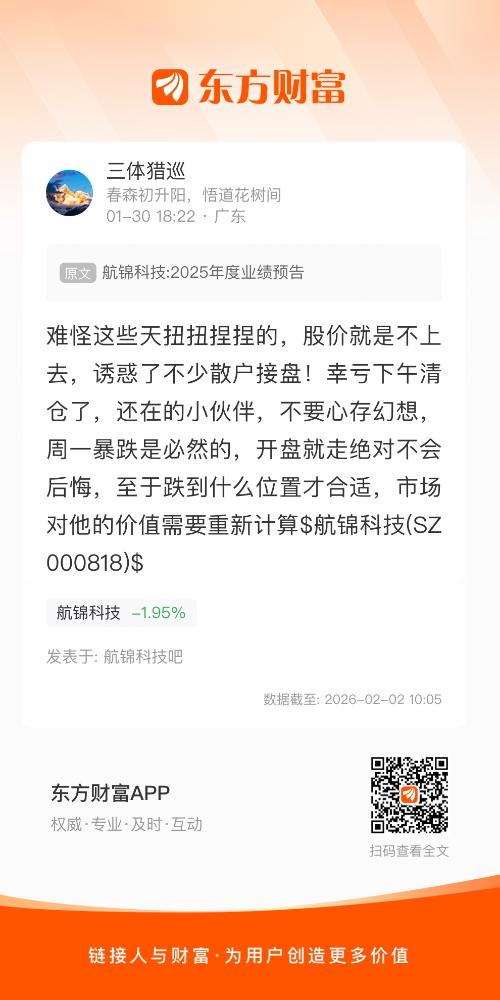 难怪这些天扭扭捏捏的,股价就是不上去,诱惑了不少散户接盘!幸亏下午清仓了,还在的小伙伴,不要心存幻想,周一暴跌是必然的,开盘就走绝对不会后悔,至于跌到什么位置才合适,市场对他的价值需要重新计算$航锦科技(SZ000818)$