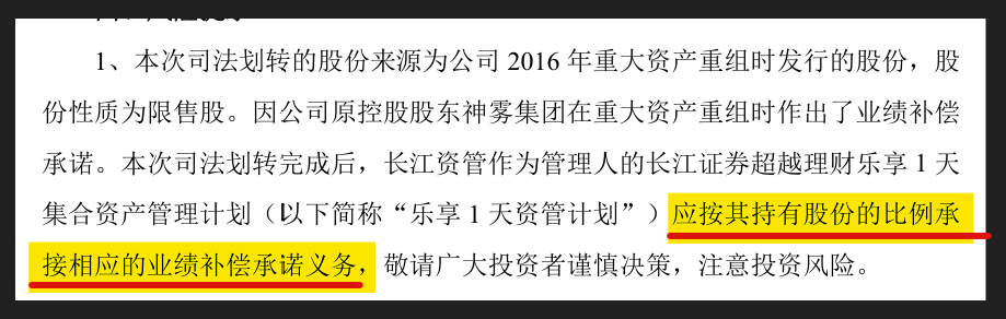 根据公告,所有划转股权都要按比例承担业绩补偿。此举已达成共识,否则 包括前期划转股权(共3.5亿股)均无法上市流通。