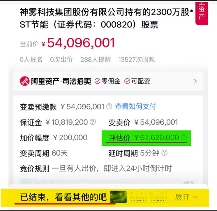 另外再加上补偿款每股1.85元,合每股4.79元。而目前*ST节能的股价是3.66元,你说网上变卖有何意义?哪个冤大头会买呢?