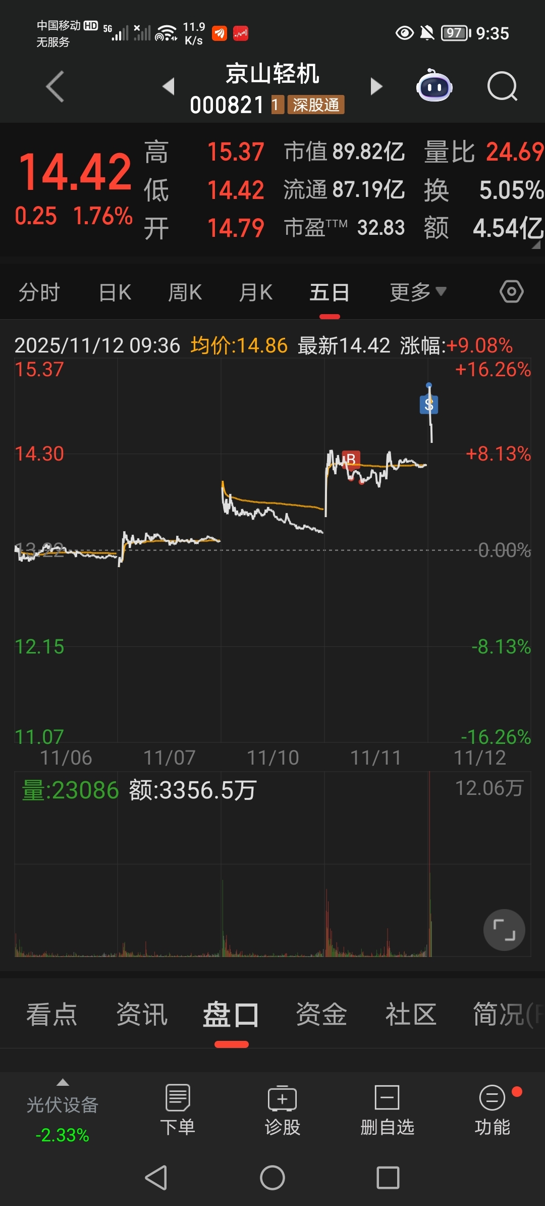 $京山轻机(SZ000821)$ $赛伍技术(SH603212)$ 昨天的半路票大家记得获利了结,一定要像机器人一样机械试严格执行,师傅赚个盒饭钱已经开路,恭喜大家!我们就是要赚这种钱,先看看行情如何这会儿资金还没有明确方向!