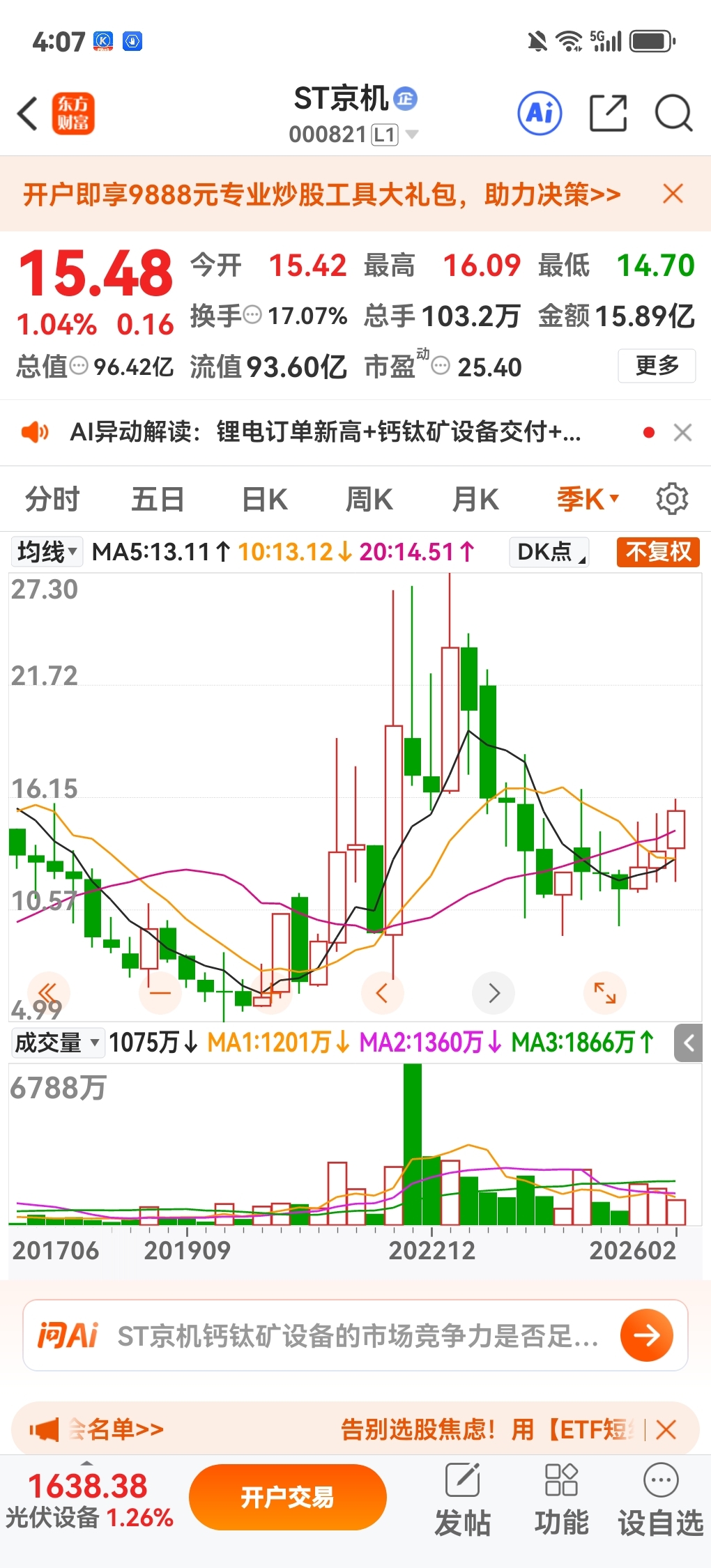 $ST京机(SZ000821)$ 多看看大周期的主力运作,季线,月线,周线。搞清楚几件事情:机构调研后股价是涨是跌!京机股价目前所处的目置是高位还是低位!京机在北美光伏设备行业的市场地位究竟如何,特别是组件细分领域京机是全球龙头,几乎可以确定马斯克跳不开京机的设备!马斯克在电力缺口巨大的北美上光伏产能是炒作还是有实际需要!结论只有一个字:涨!!!可能过程会有反复,