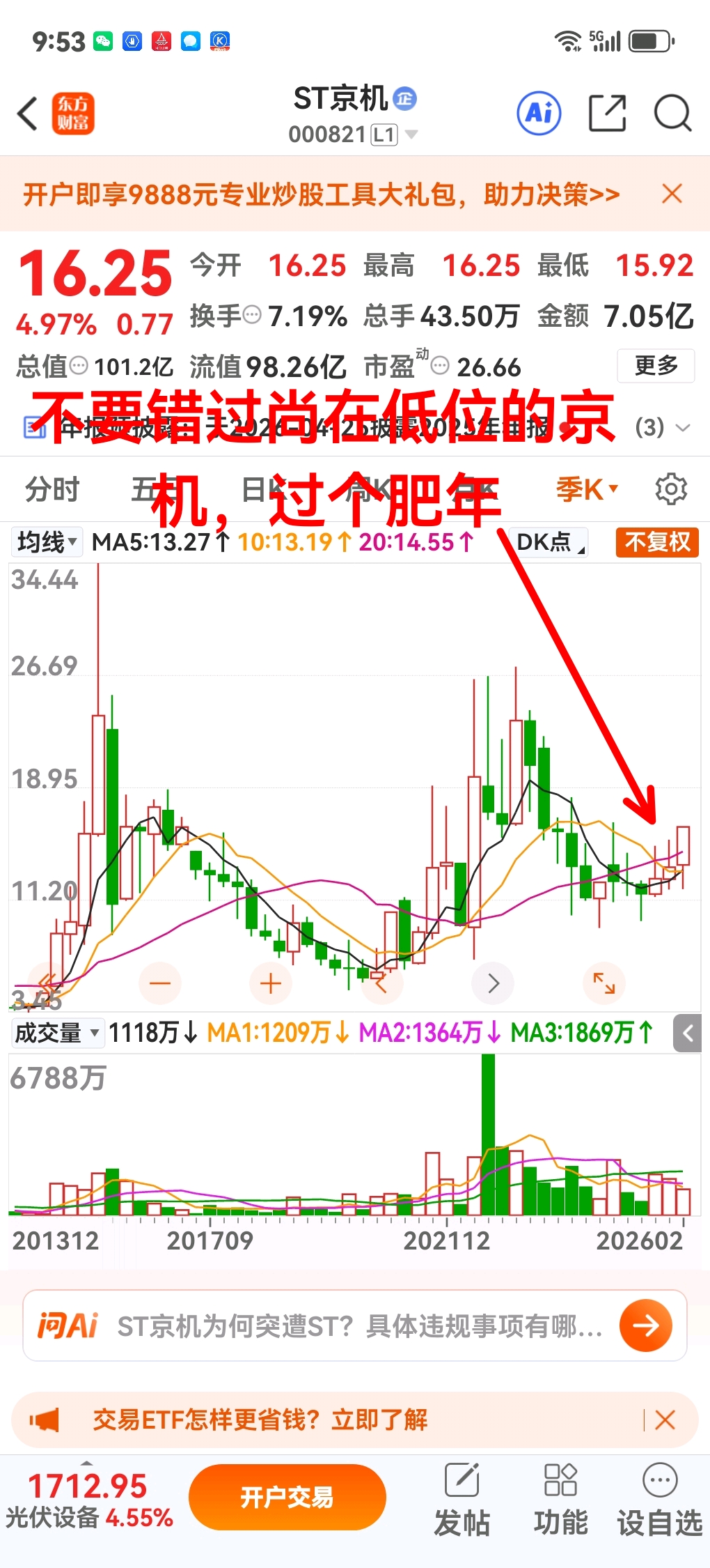 如图,不要错过尚在低位的ST京机,过个肥年