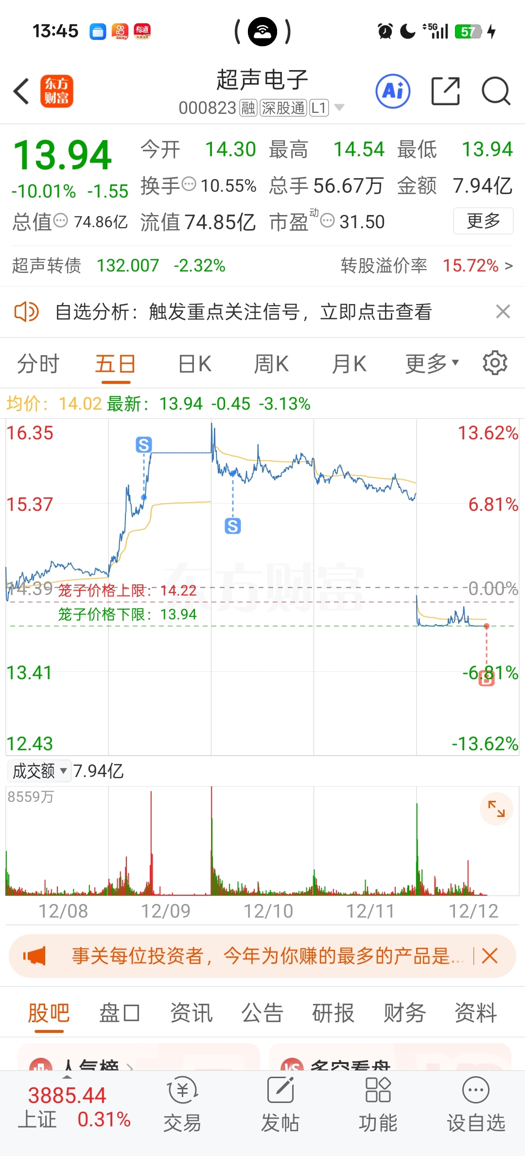 $超声电子(SZ000823)$ 前两天拍断大腿,涨停没有卖,今天忙昏头了,一看价格回来了,先搞上半仓再说,就当前两天没卖