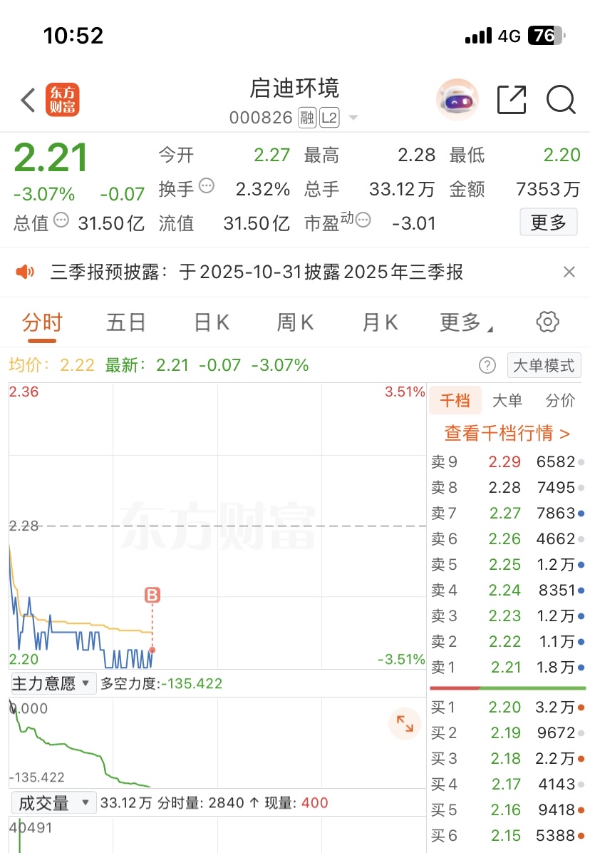 $启迪环境(SZ000826)$ 2.21买入4万股,就这样吧!!!有本事跌停!