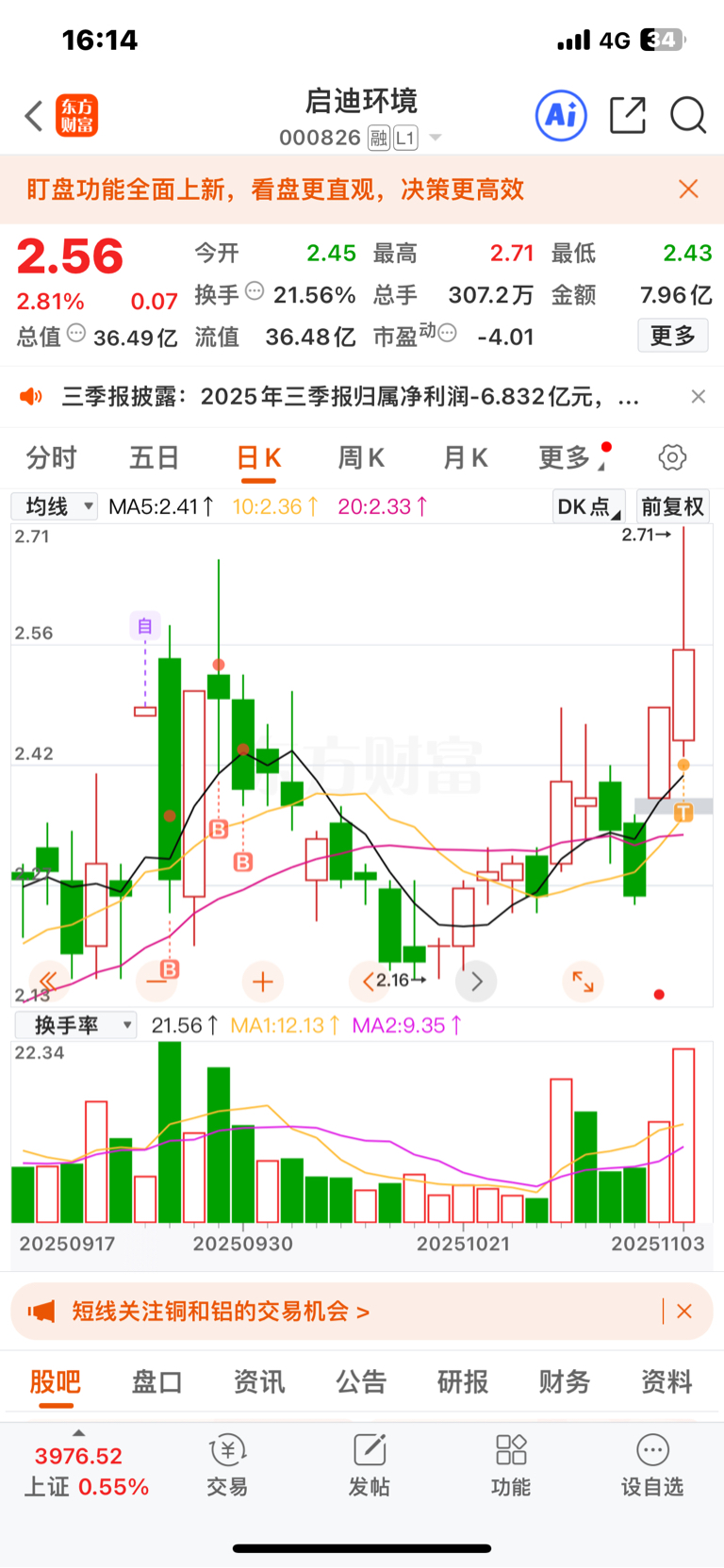 $启迪环境(SZ000826)$ 做了个小T,成本降了3分钱
