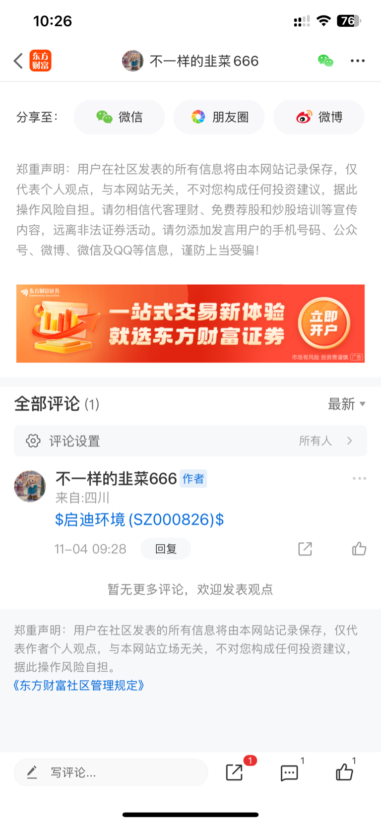温馨提示: 1.根据《证券法》规定,禁止编造、传播虚假信息或者误导性信息,扰乱证券市场;2.用户在本社区发表的所有资料、言论等仅代表个人观点,与本网站立场无关,不对您构成任何投资建议。用户应基于自己的独立判断,自行决定证券投资并承担相应风险。《东方财富社区管理规定》