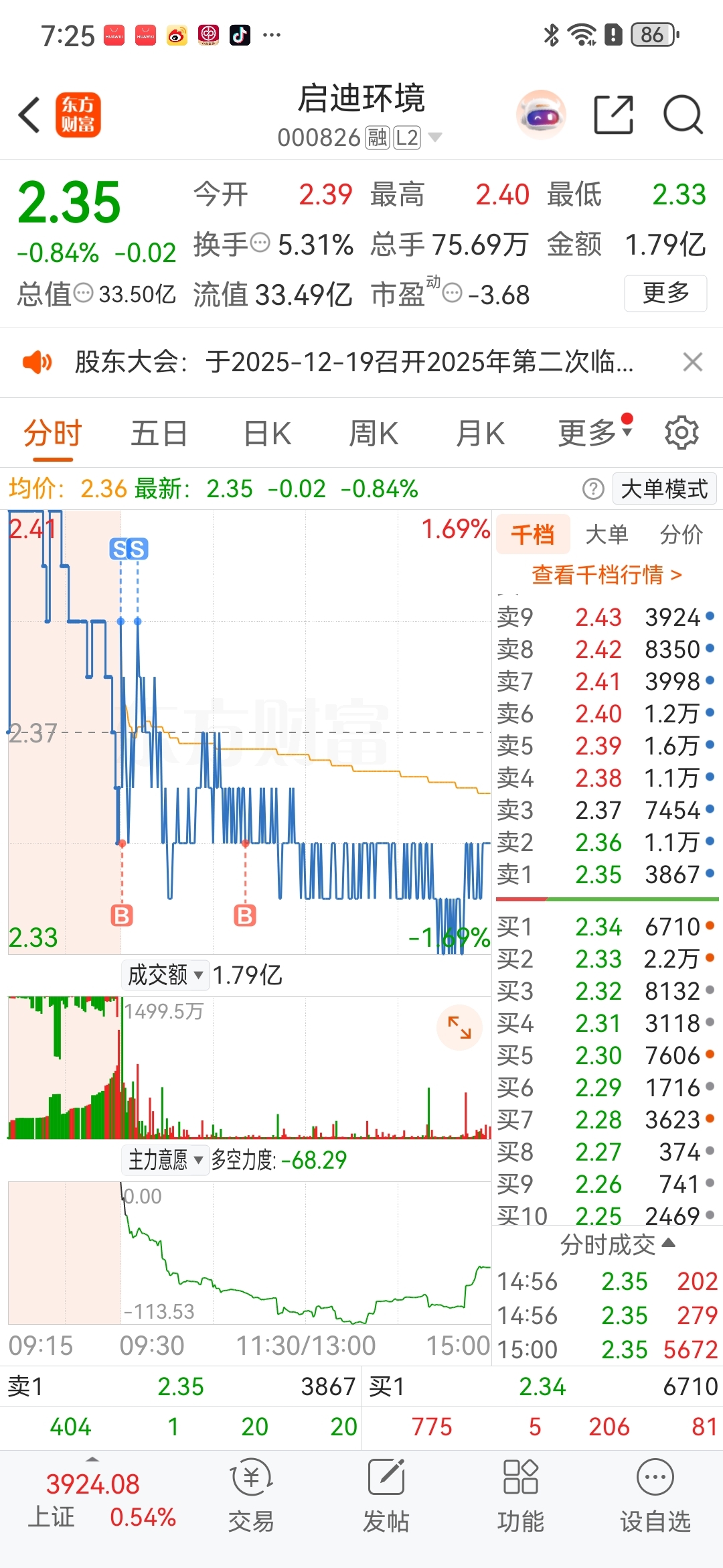 $启迪环境(SZ000826)$ 集合竞价就不强,一开盘发现资金流出