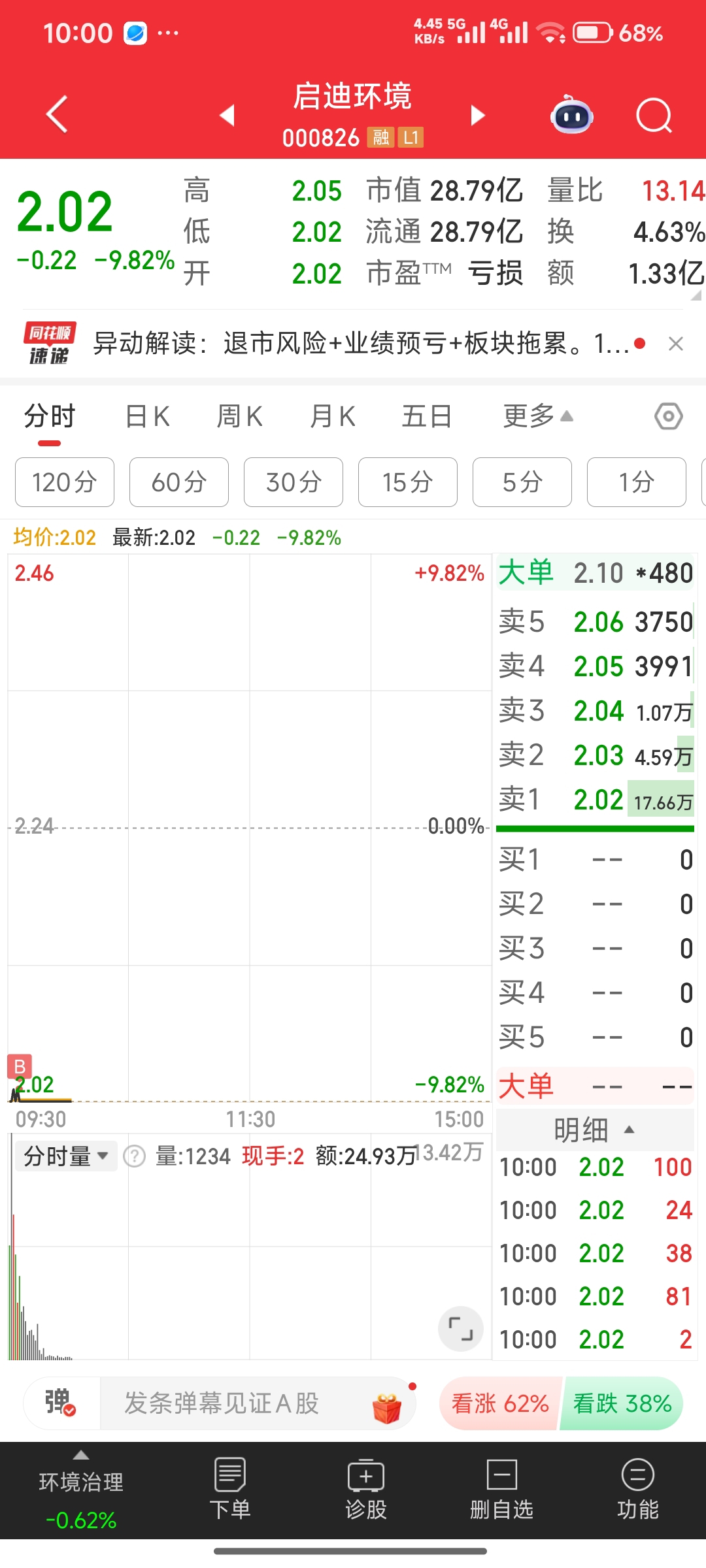 $启迪环境(SZ000826)$ 天塌了,没看公告就瞎买,还以为是受大盘低开的影响低开,还以为来抄底,还好没有梭哈。