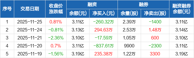 融资方面,当日融资买入1004.52万元,融资偿还1264.84万元,融资净偿还260.32万元。融券方面,融券卖出0股,融券偿还1400股,融券余量2.39万股,融券余额26.7万元。融资融券余额合计3.11亿元。