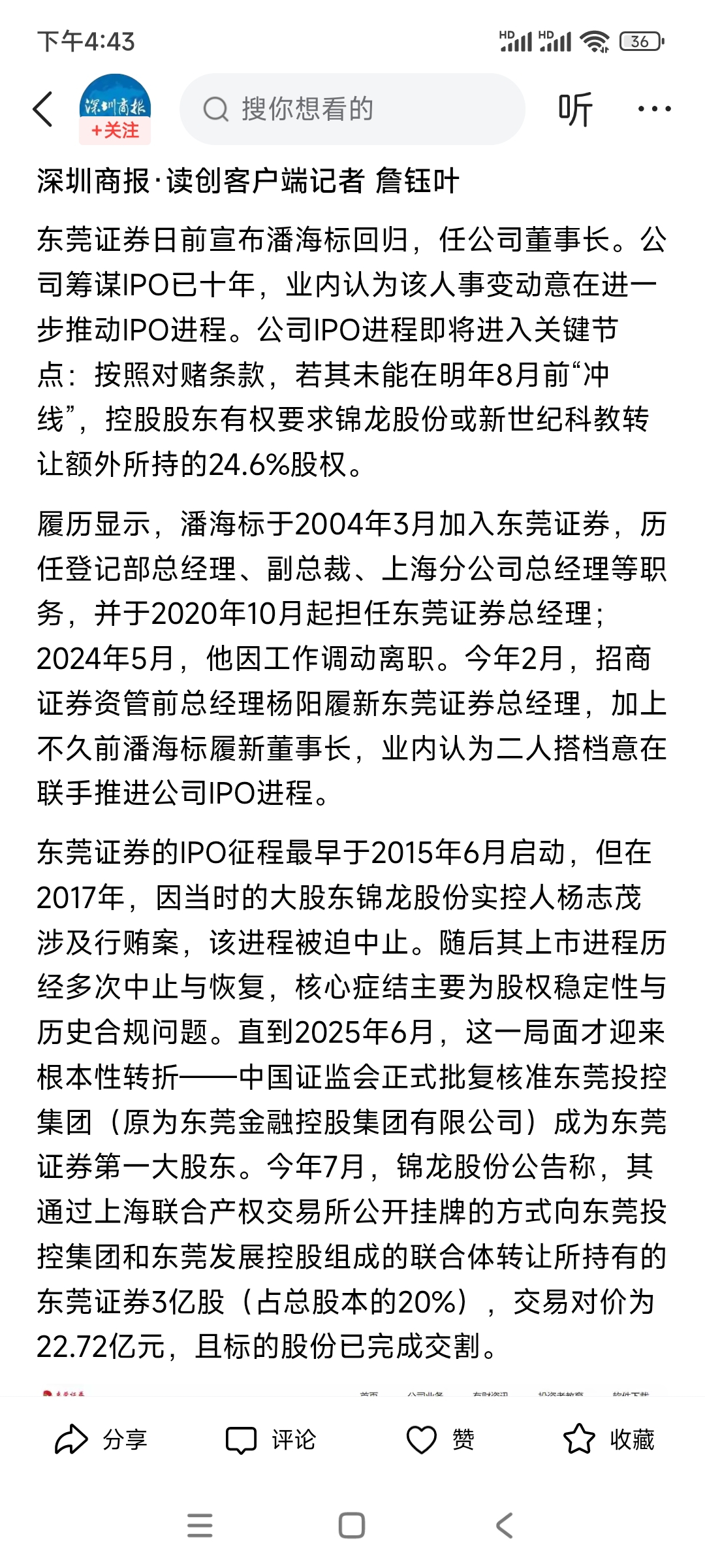 好事将近,明年8月份上市,如果不成功,根据对赌协议,锦龙将转让20%的东莞证券股