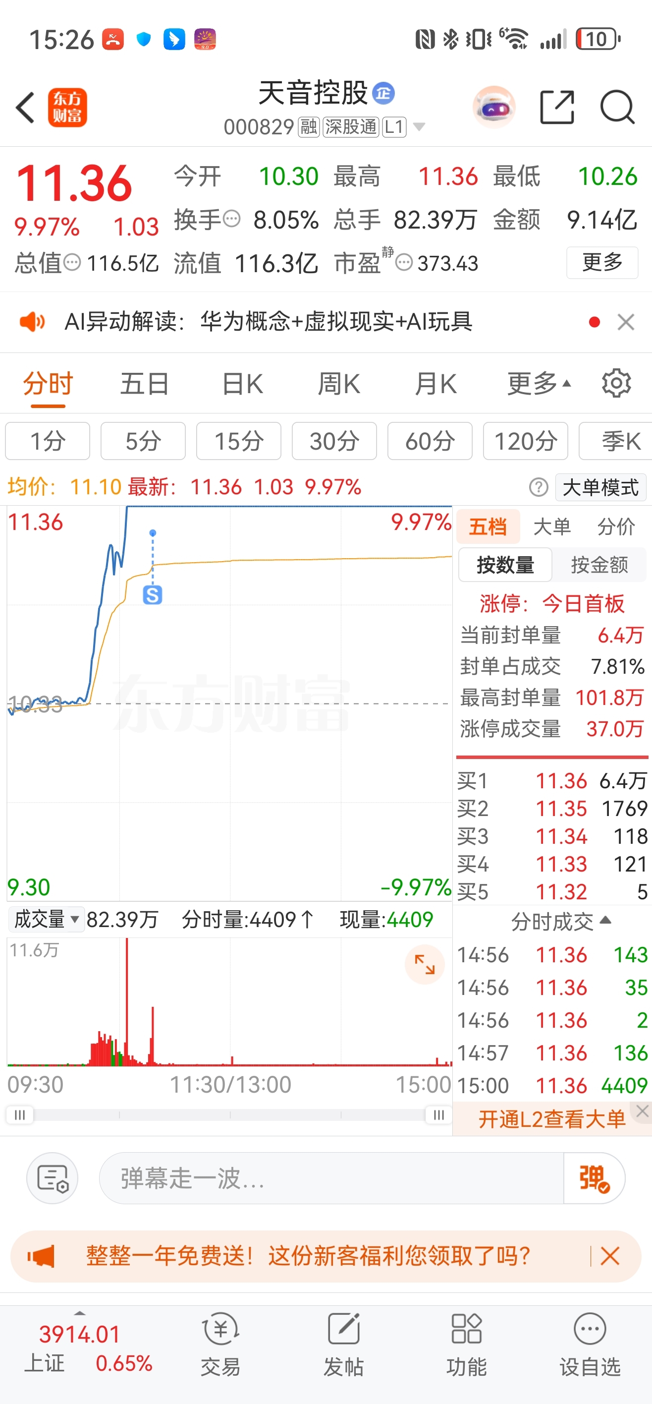 $天音控股(SZ000829)$ 设了个破板就卖的条件单