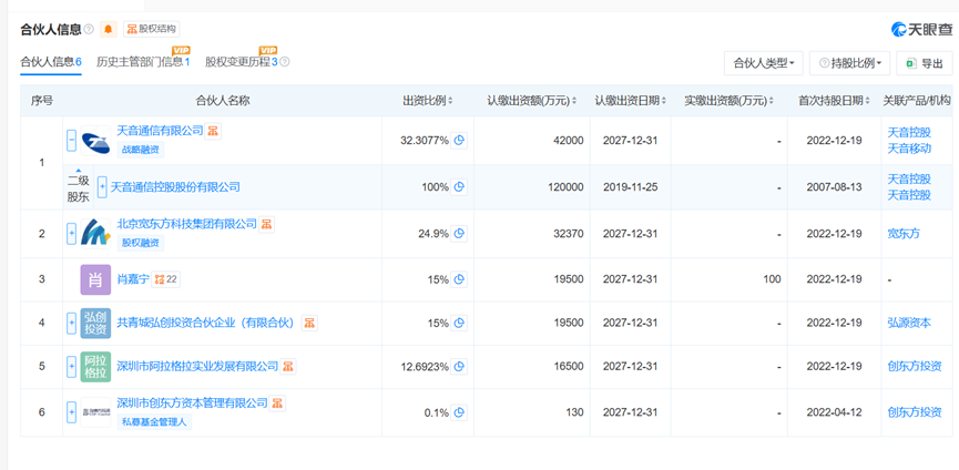 2023年2月,天音控股发布公告称,为进一步加强产业布局,公司子公司天音通信拟向华科基金增加投资1.6亿元,用于对优质产业互联网项目扩大投资。本次投资完成后,天音通信出资额由2.6亿元增加为4.2亿元,出资比例为32.3077%。