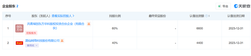 天眼查显示,华科基金于2023年入股酒快到,持有60%股权,认缴出资额6600万元。酒快到原控股股东酒仙网络科技股份有限公司(以下简称:酒仙)持股比例下降至40%。