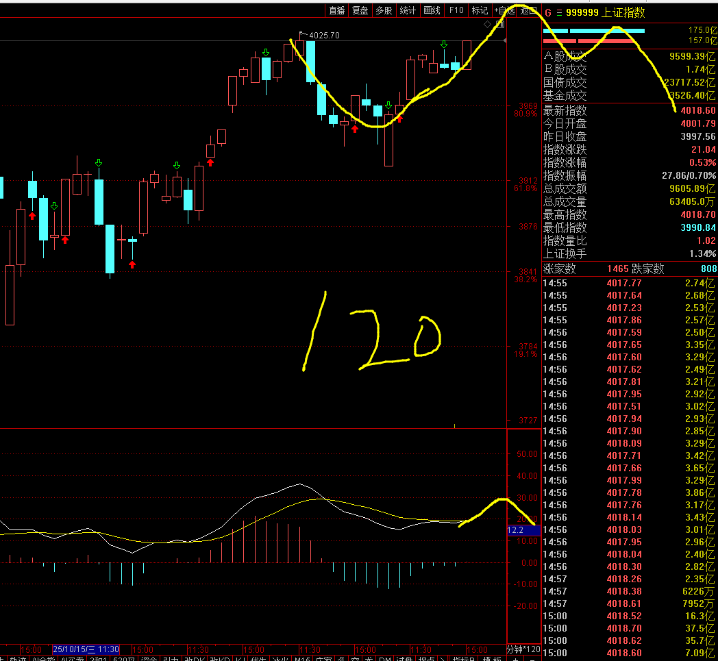 中午在文档的追加里面给大家讲了,今天下午指数还会拉起来,而且说了收盘会在4010点上方,今天收盘点位4018点,这都是意料之中的,在上个星期四文章里面我也给大家讲了上证指数在这个地方会有1~2天的横盘,上证指数横盘了一天半,上个星期五上证指数是调整的。今天上午是横盘下午拉起来的,这是不是意料之中呢?上个星期四还给大家讲了券商和保险在这个地方会围绕120分钟的布林线中轨位置。附近横盘1~2天,然后再拉起来把指数带领过4025点,这个走势也是我们意料之中的。https://caifuhao.eastmoney.com/news/20251107181924717773750