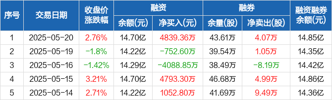 中国稀土:融资净买入4839.36万元,融资余额14.7亿元(05-20)