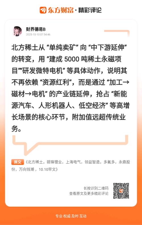 //@财界德易B :北方稀土从 “单纯卖矿” 向 “中下游延伸” 的转变,用 “建成 5000 吨稀土永磁项目”“研发微特电机” 等具体动作,说明其不再依赖 “资源红利”,而是通过 “加工→磁材→电机” 的产业链延伸,抢占 “新能源汽车、人形机器人、低空经济” 等高增长场景的核心环节,附加值远超传统业务。 $中国稀土(SZ000831)$$北方稀土(SH600111)$$华工科技(SZ000988)$