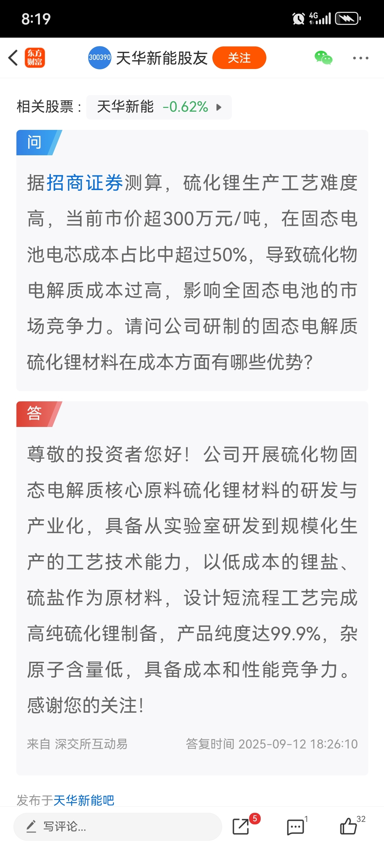 2.天华新能的子公司天宜锂业,用高纯黄铁矿制备硫化锂,具有极大的成本优势。