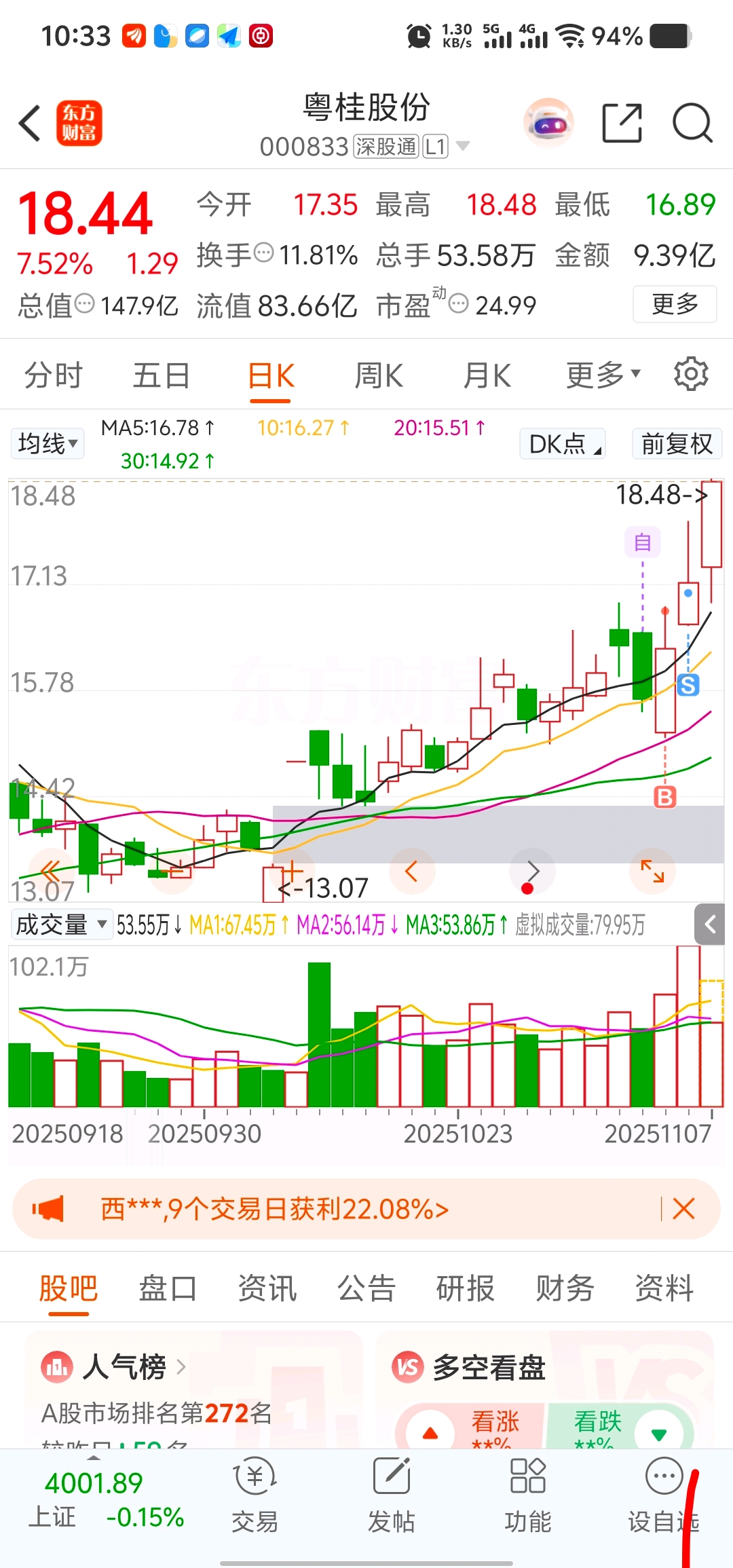 $粤桂股份(SZ000833)$ 昨天感觉都涨不动了那么长一根上引线尾盘卖了 今天怎么还能拉