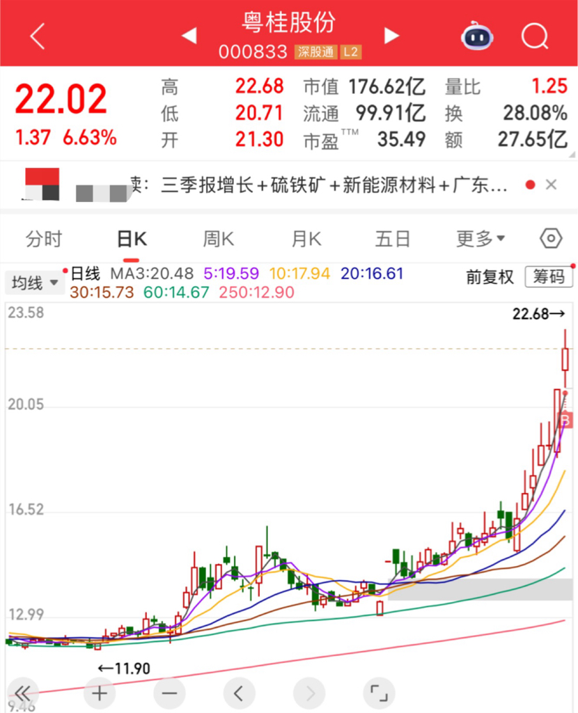 今天短线新开去了粤桂股份。盘中分时低吸,小红5个点。涨价线低位的补涨,硫酸涨价概