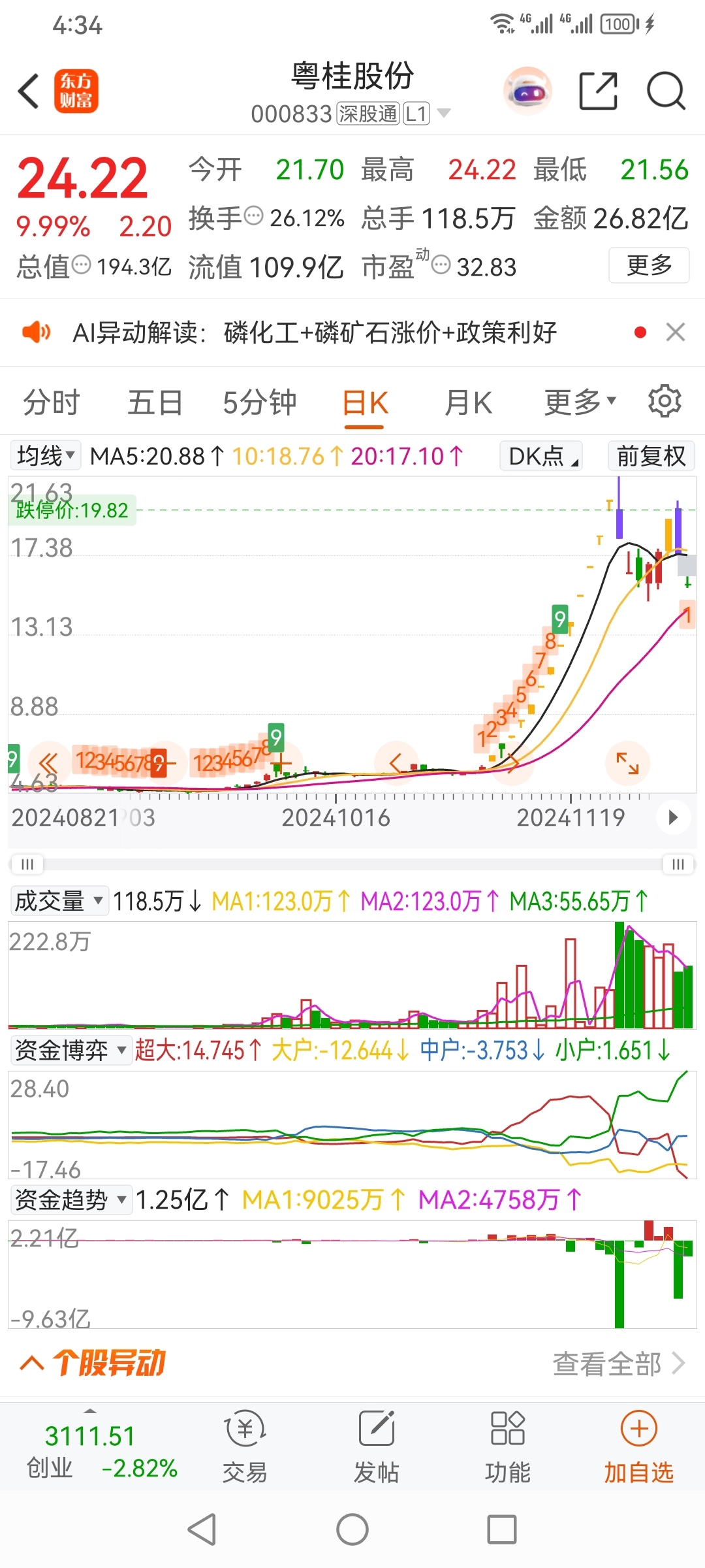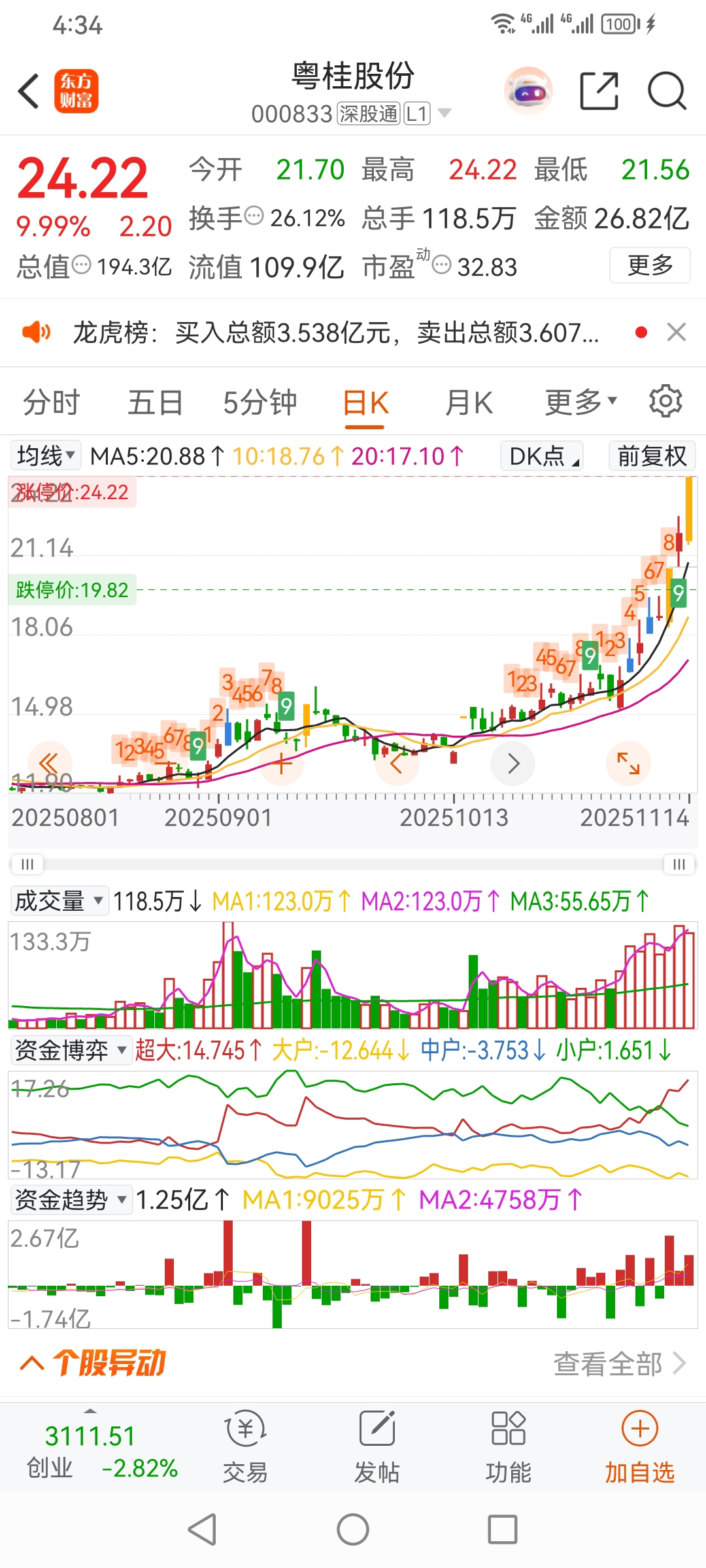 方军,粤桂股份,财运没有抓住。预防股票跌停板,仓位控制,个股在1/3。如果早盘加