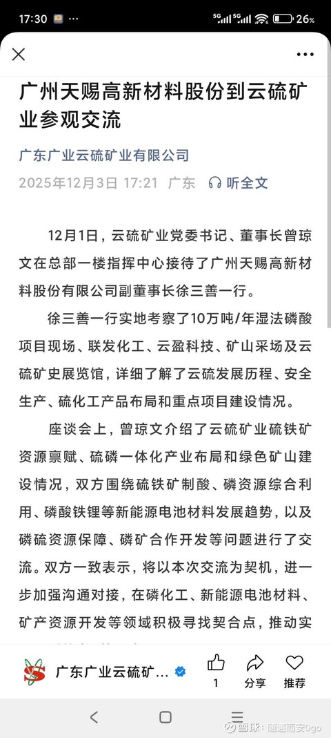 12月1日 粤桂股份旗下的云硫矿业与天赐材料(002709)$等企业合作讨论磷化工,新能源电池材料啊,明摆着要一起搞固态电池合作了啊!!