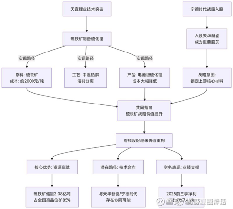宁德时代入股天华新能,天华新能子公司天宜锂业硫化铁制备硫化锂专利公布,这些都预示着000833粤桂股份估值重构。天宜锂业硫铁矿制硫化锂路线通过原料成本优势、工艺创新及副产物回收,已将综合成本降至行业领先水平,未来规模化后成本有望进一步压缩至12-15万元/吨,显著低于传统硫磺路线(400万元/吨以上)。当前的行业技术突破和巨头布局,正在提升市场对粤桂股份旗下高品位硫铁矿资源价值的预期。要理解这些事件为何关键,我们可以通过下面这张图,看清它们之间的内在联系以及对粤桂股份的潜在影响。