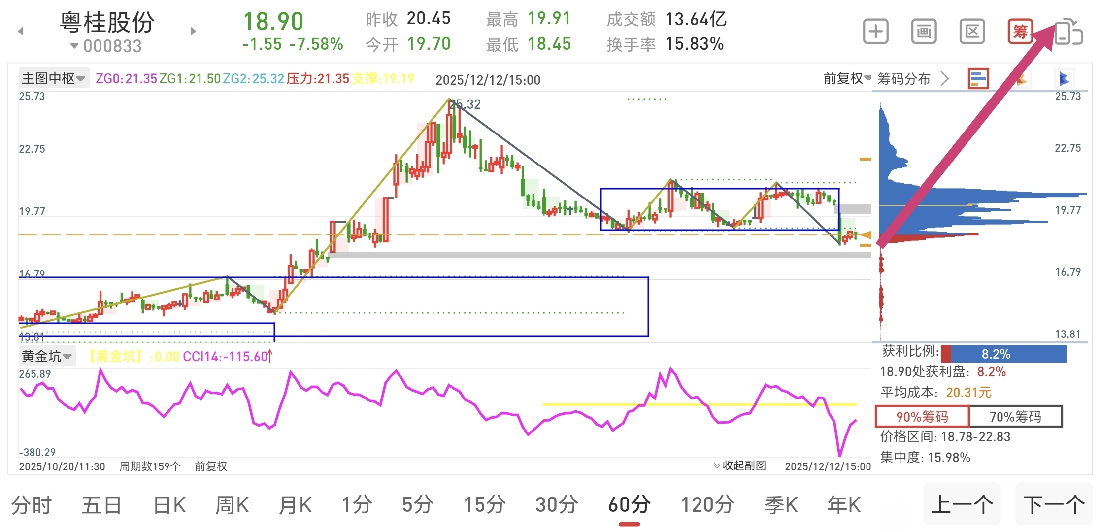 没有任何利空,为何大跌?缠论角度看粤桂60分钟,背驰结构出现,也就是多空双方在前