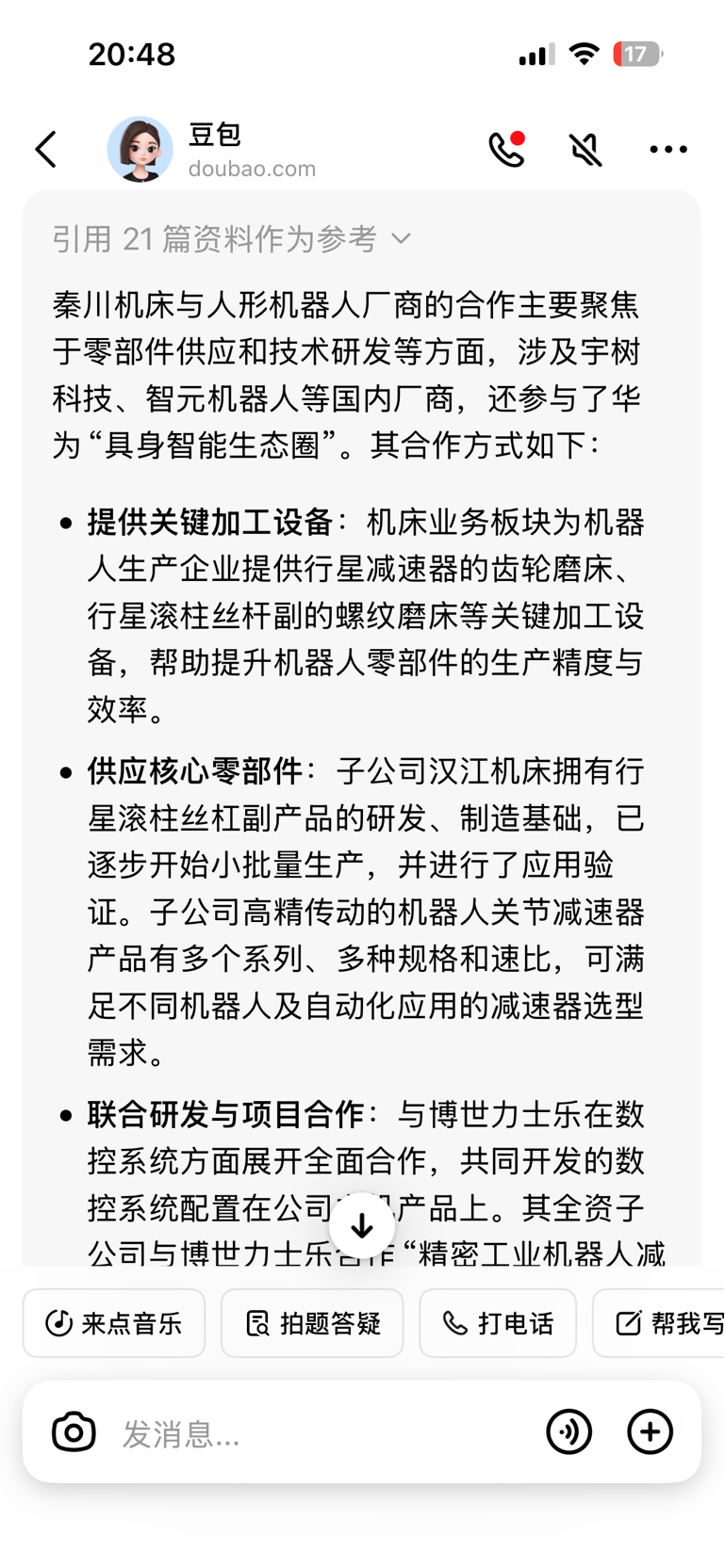 $秦川机床(SZ000837)$ 秦川机床与人形机器人厂商的合作主要聚焦于零部件供应和技术研发等方面,涉及宇树科技、智元机器人等国内厂商,还参与了华为“具身智能生态圈”。