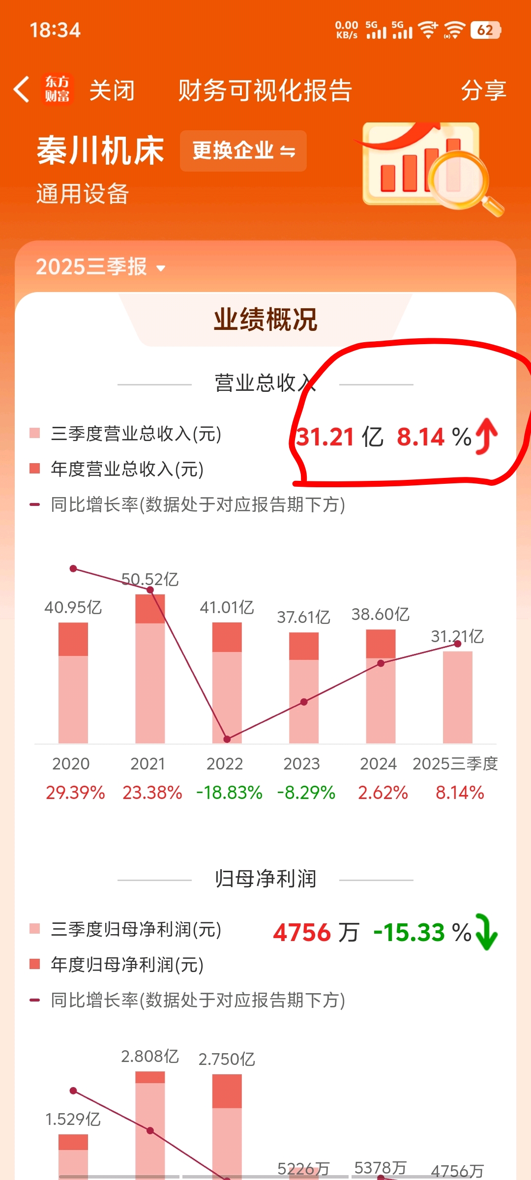 $秦川机床(SZ000837)$ 截止三季度今年已经31亿 ,去年一整年营收才38亿,今年还最后一个季度没结束。